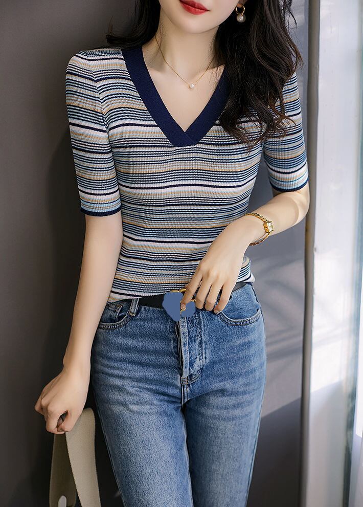 ストライプ Tシャツ V ネックニット半袖女性 Tシャツスタイル服 Tシャツ 2022 夏レディーストップス Tシャツ ショート ハーフスリーブ サマー 夏物 Vネック Son57208545507