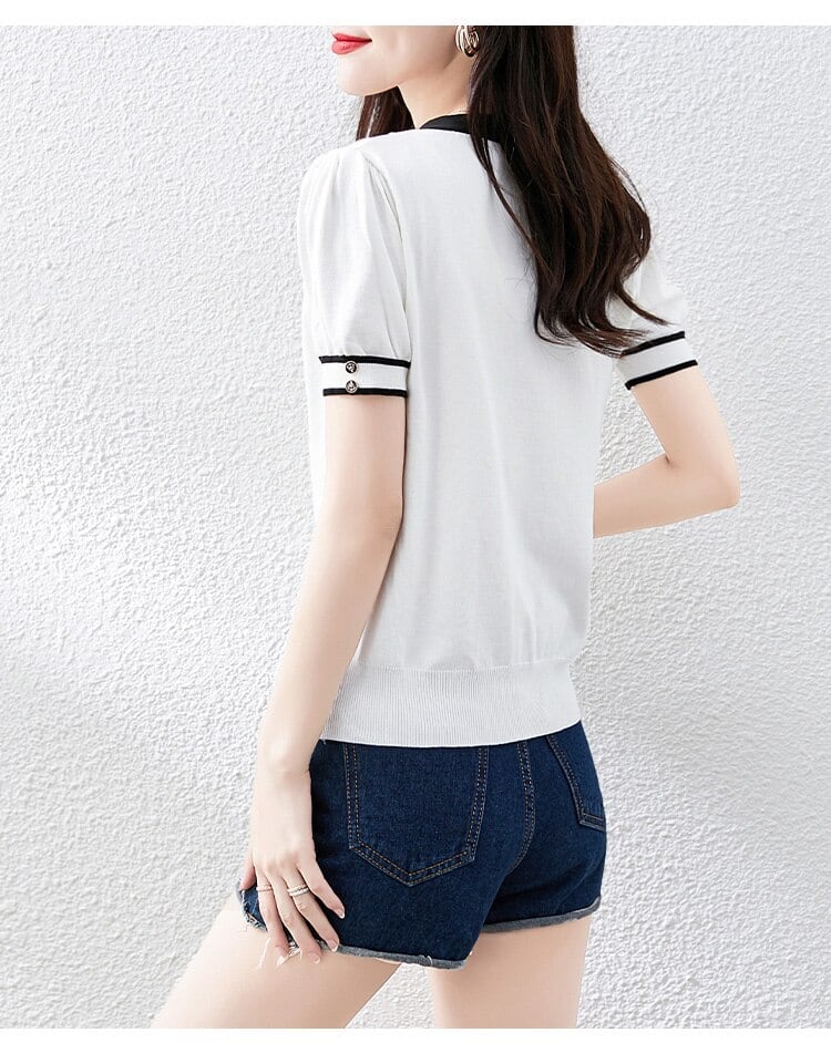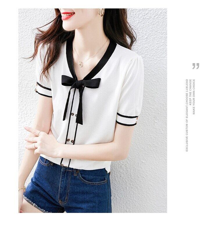 2022 夏弓 Tシャツ女性服ニット Tシャツコントラストカラートップス半袖 Tシャツ白 Tシャツ女性 ショート ホワイト リボン ハーフスリーブ サマー 夏物 Son12942447144