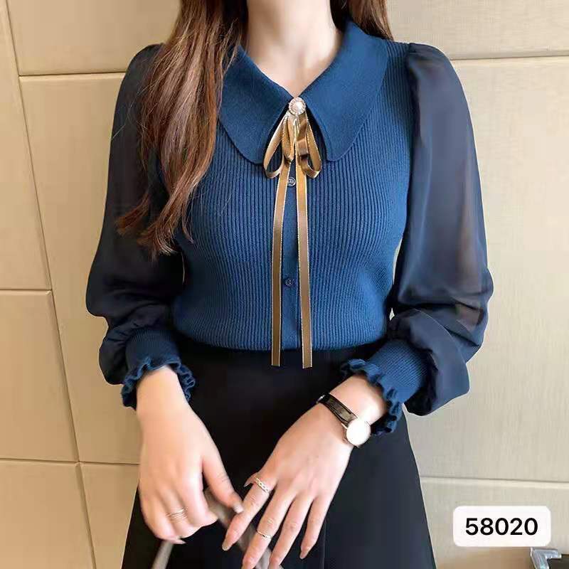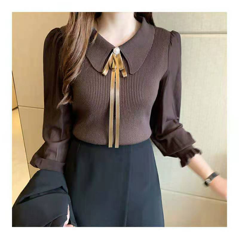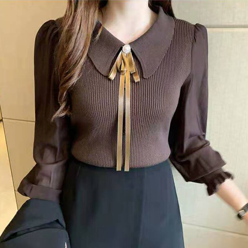 ターンダウン襟弓セーター女性シフォンパッチワーク長袖トップ服ニットプルオーバープル 2022 冬 ロング リボン ウィンター 冬物 Son6683955842