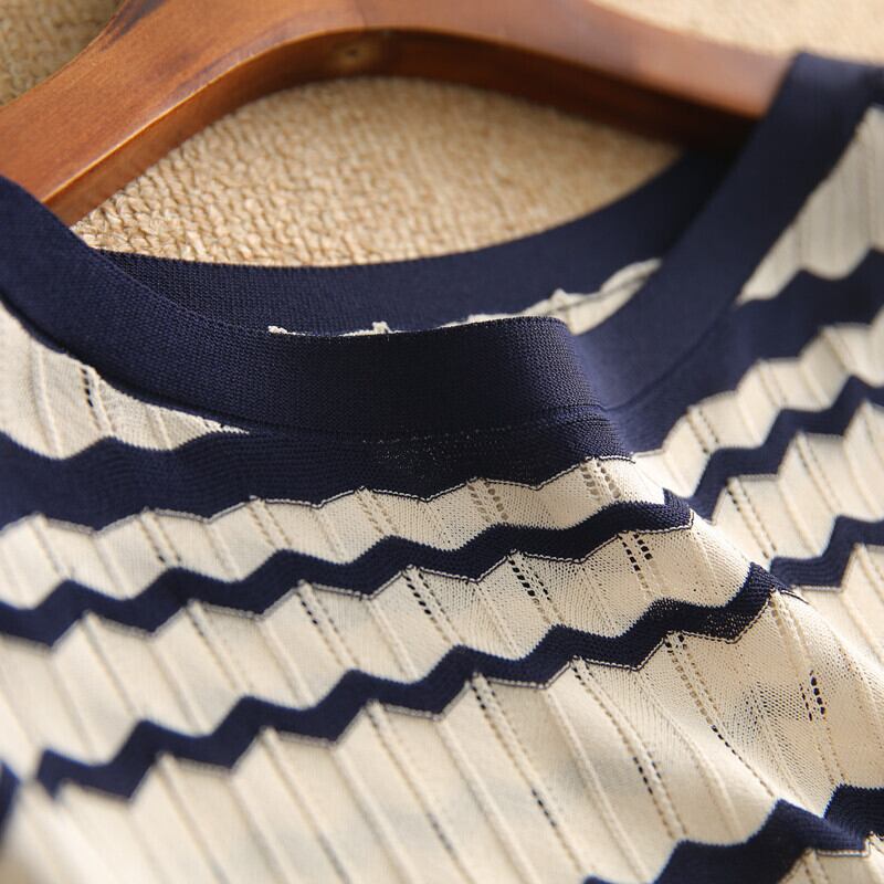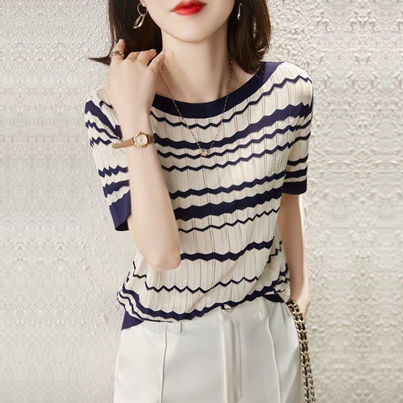 Tシャツニットストライプ Tシャツ女性半袖 Tシャツ 2022 夏の女性レディーストップス Camisetas デ ショート ハーフスリーブ サマー 夏物 Son19456900498