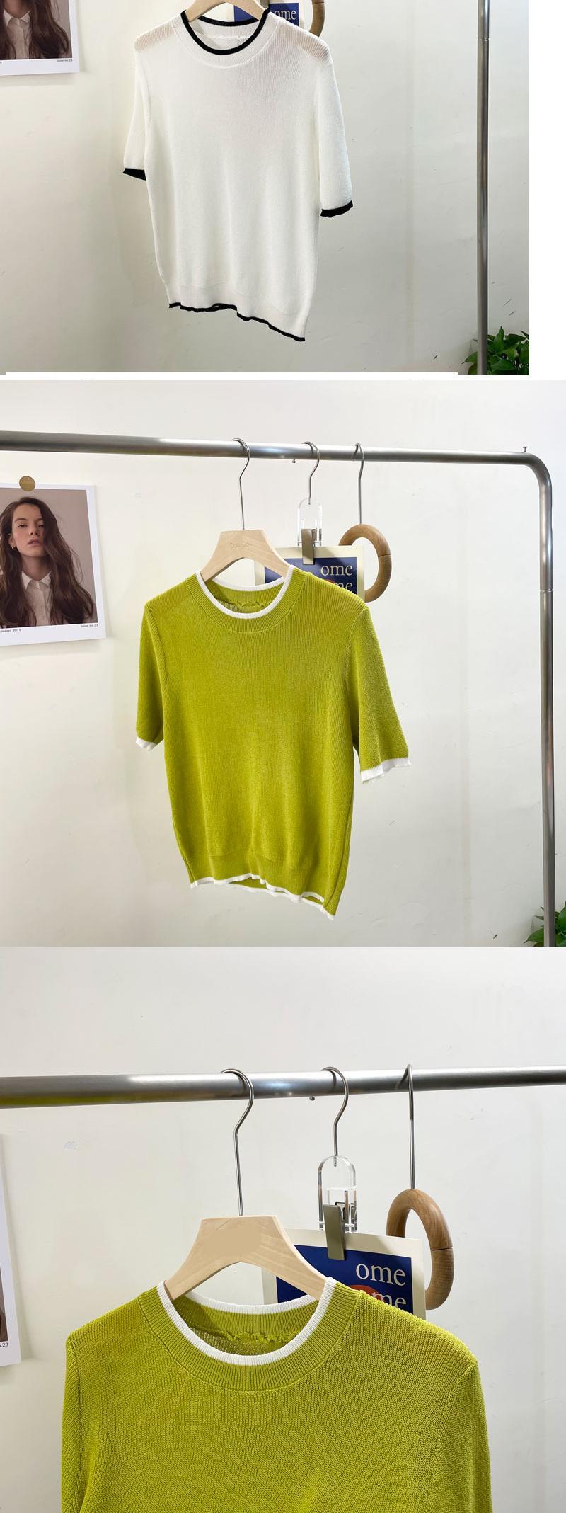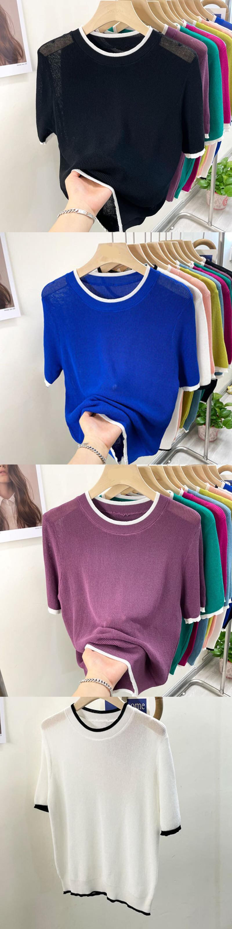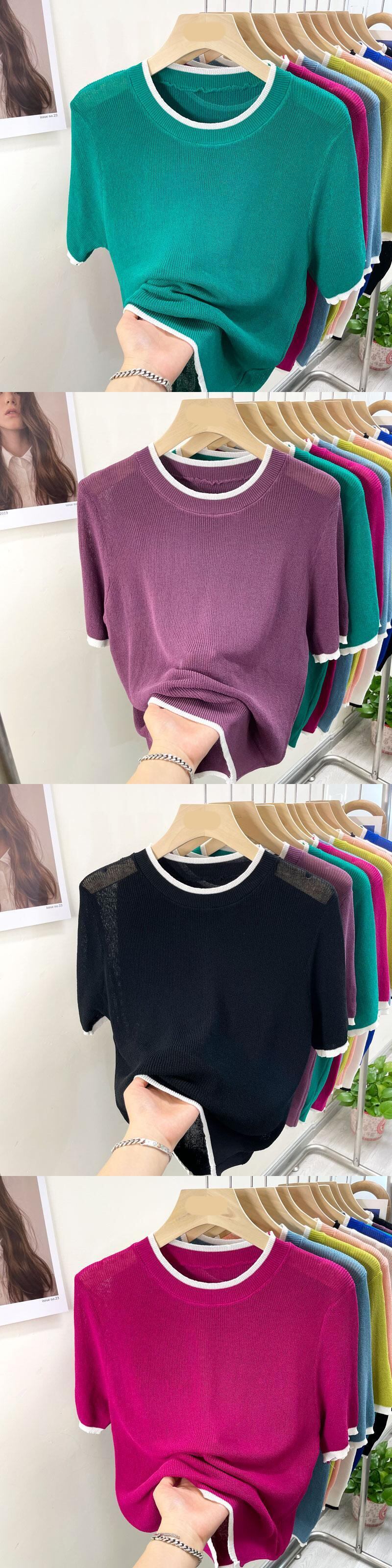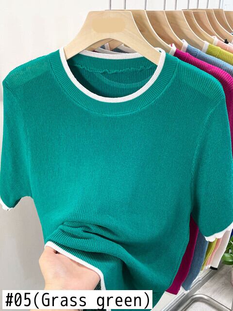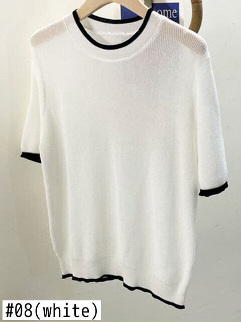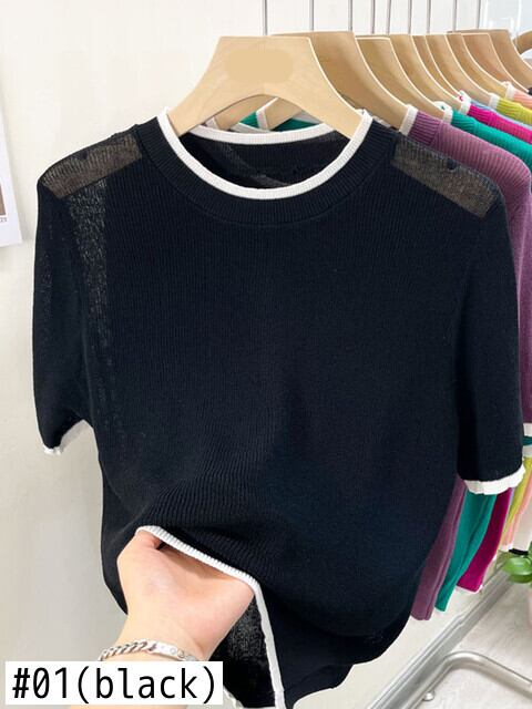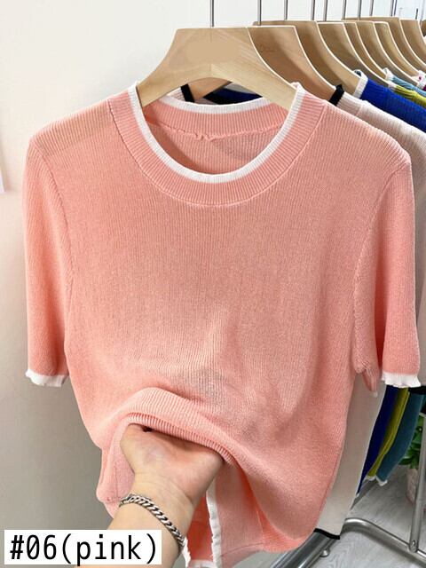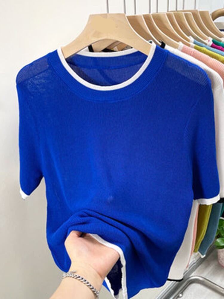 トップス女性 2022 夏の女性の Tシャツ O ネックコントラストカラーニットトップ半袖 Tシャツスリム弾性服 ショート ハーフスリーブ エラスティック 伸縮 サマー 夏物 Oネック Son60179648174