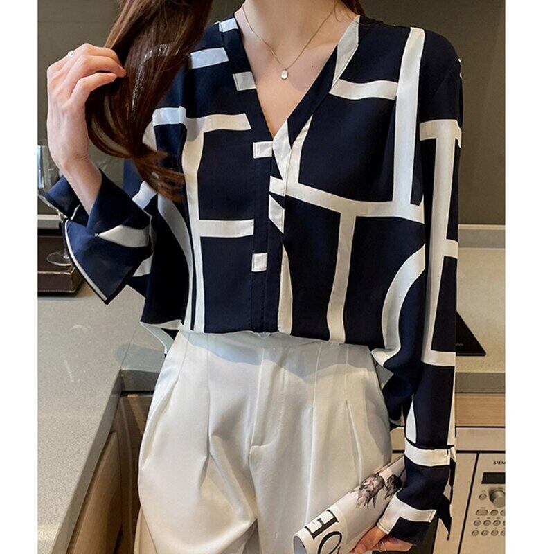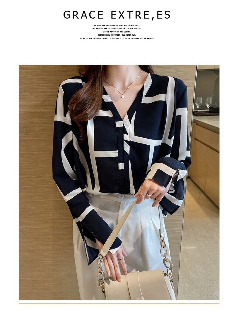 Vネックブラウス女性2022春秋ブラウスシフォン長袖トップスルーズシャツカミーサ ロング スプリング 春物 オータム 秋物 Son60671611049