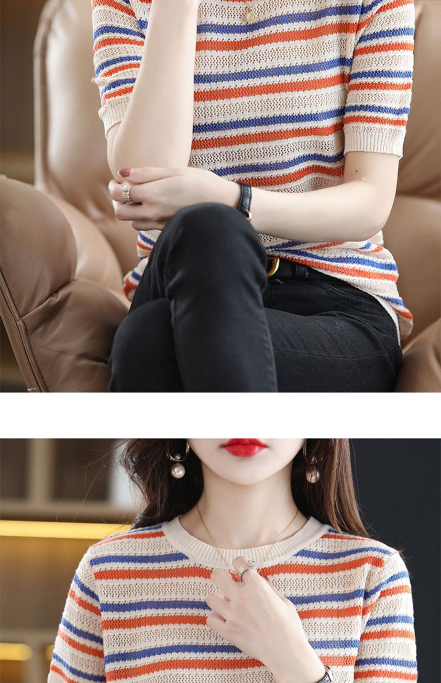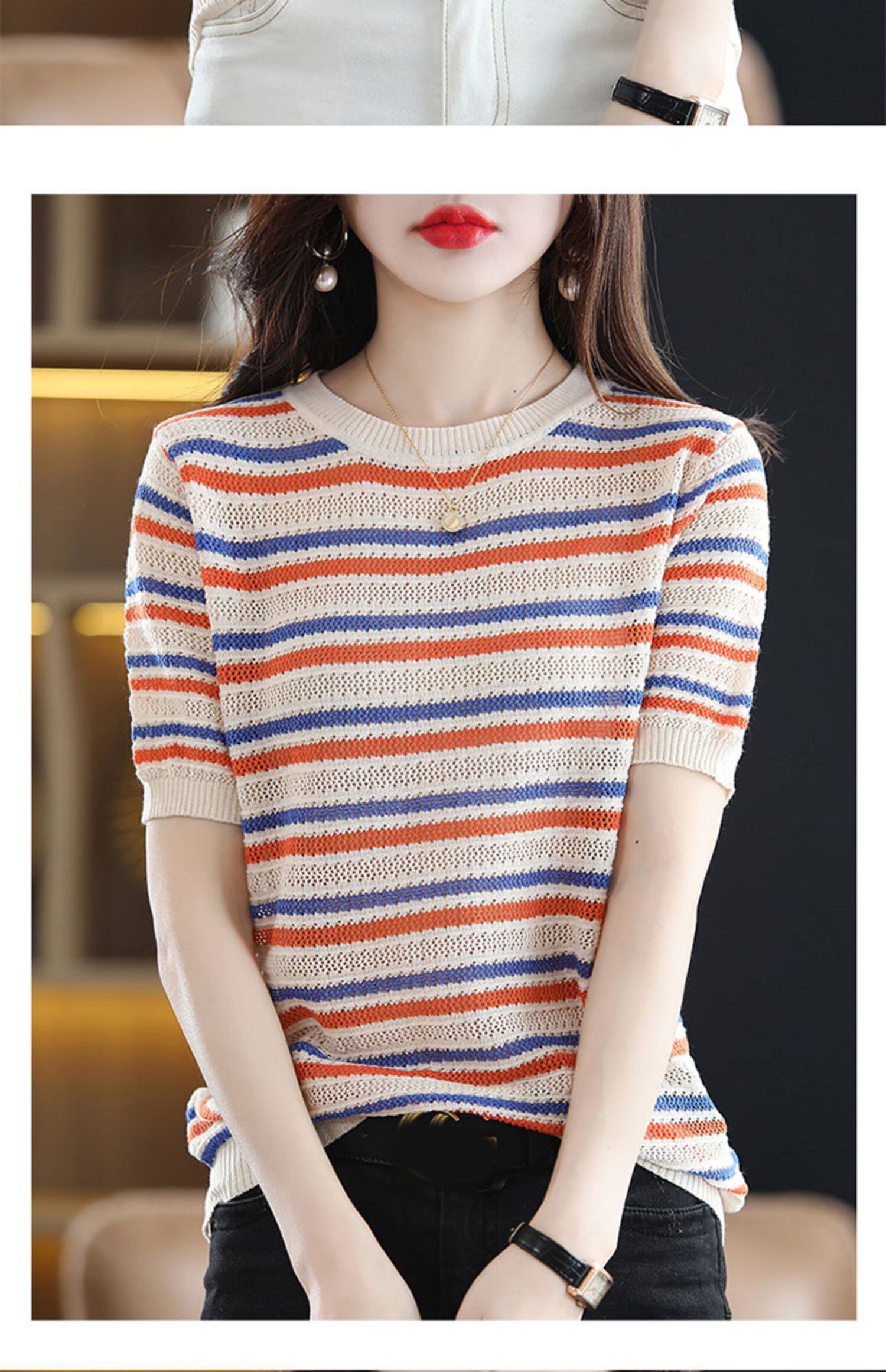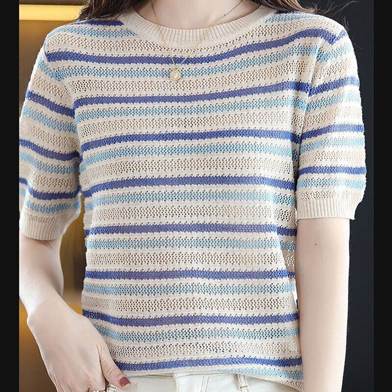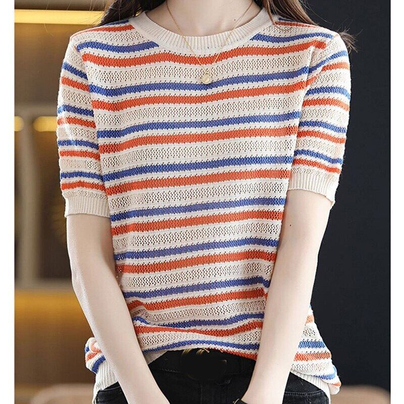 ニット Tシャツ女性 2022 ストライプ半袖 Tシャツ夏の女性トップス O ネック Camisetas デ ショート ハーフスリーブ サマー 夏物 Oネック Son74898523545