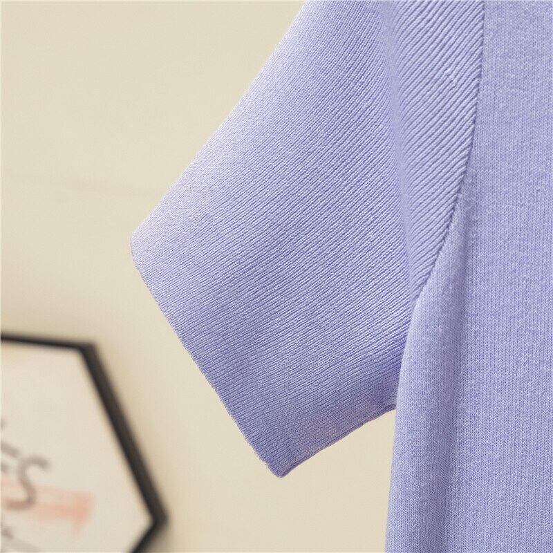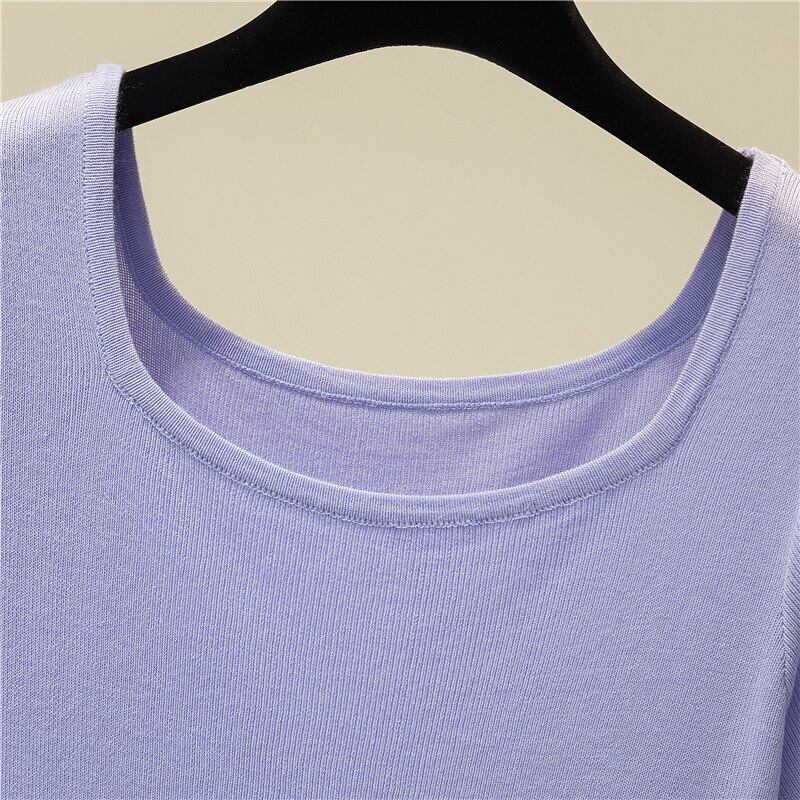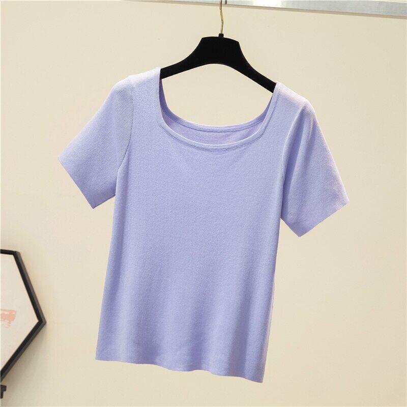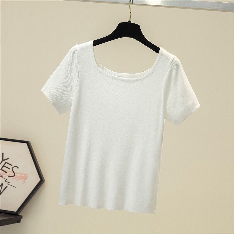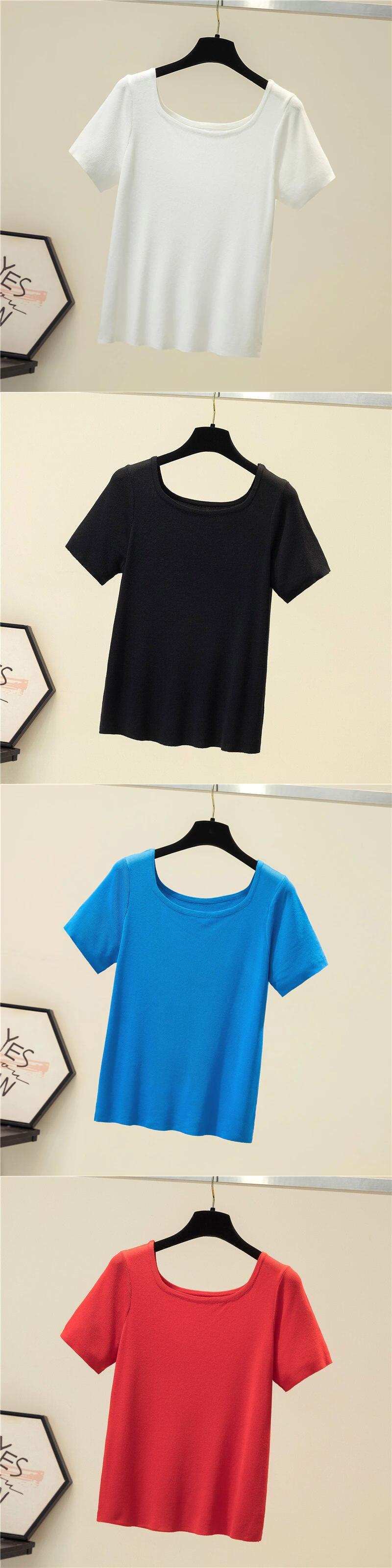 LJSXLS スリムニットスクエアカラーレディース Tシャツ半袖 Tシャツ無地の服の女性の夏のオールマッチブルートップ ショート ハーフスリーブ サマー 夏物 ソリッドカラー スクウェア Son12759466457