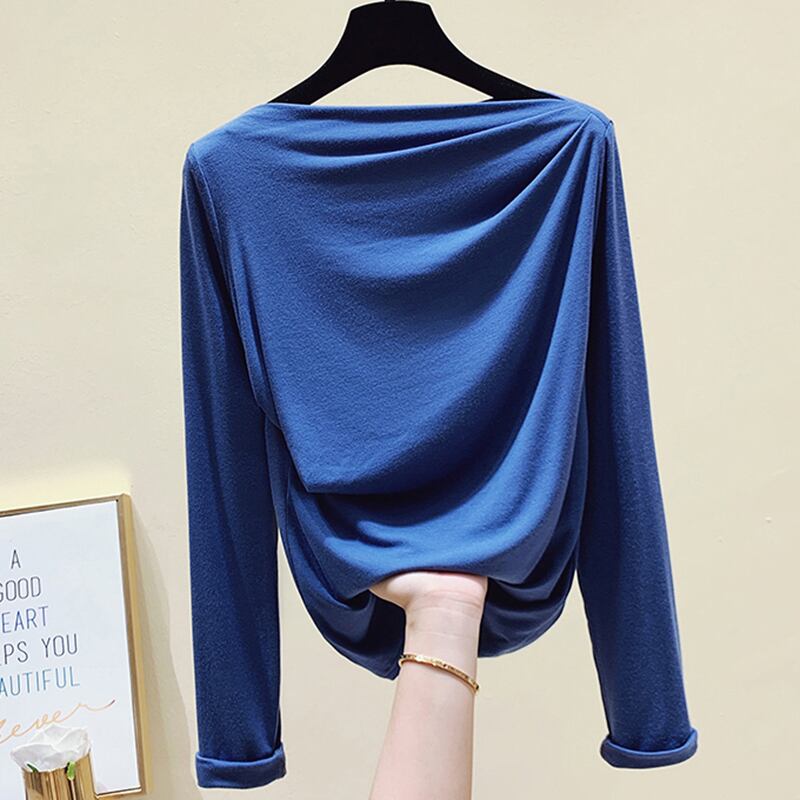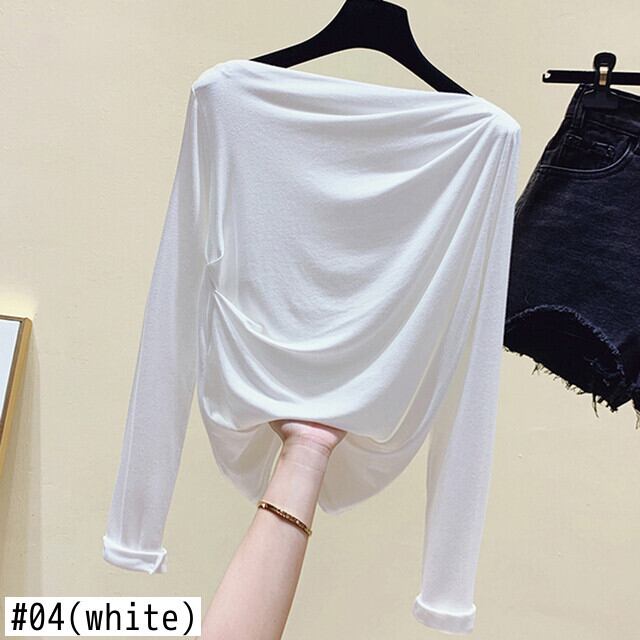 スタイルスラッシュネック長袖 Tシャツ女性 2022 春秋白スリムトップスひだソリッド Tシャツ Tシャツ ロング ホワイト スプリング 春物 オータム 秋物 ソリッドカラー Son82018158130