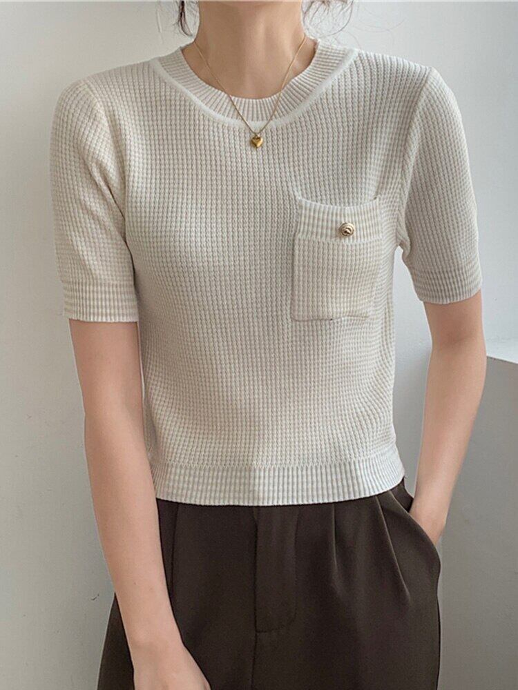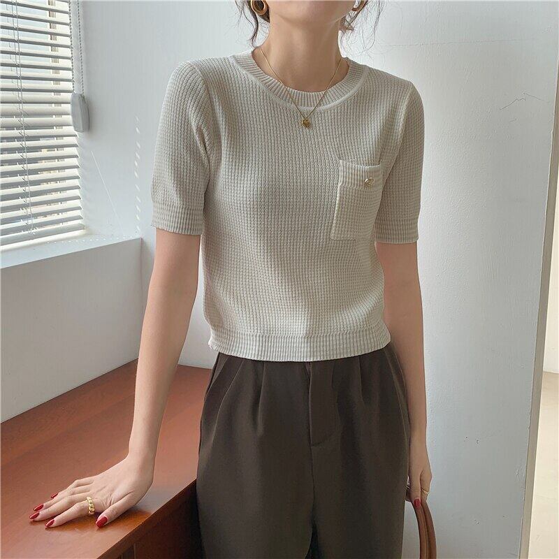 クロップトップ夏 2022 ニット Tシャツ女性服コントラストカラー Tシャツ女性ポケット半袖 Tシャツ Poleras ショート ハーフスリーブ サマー 夏物 Son93875752941