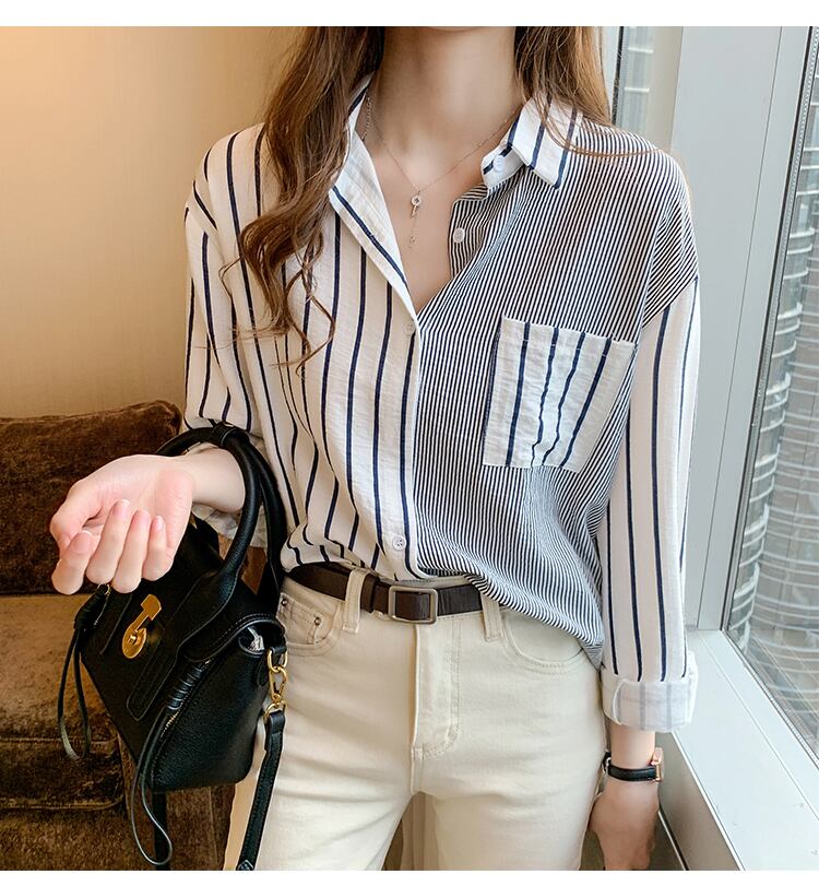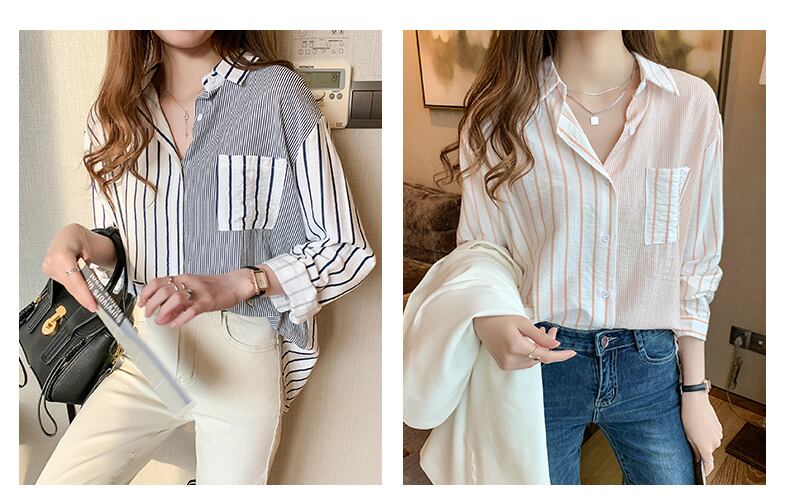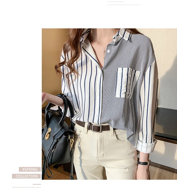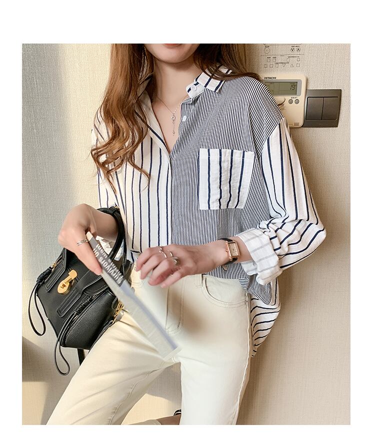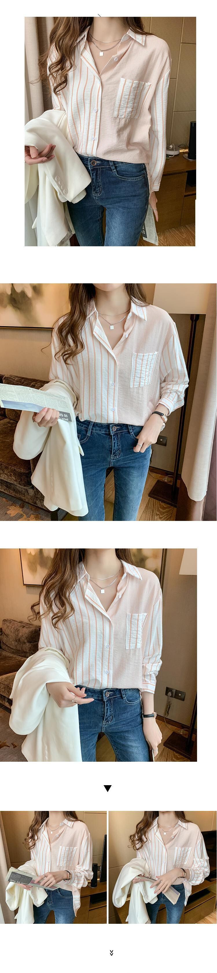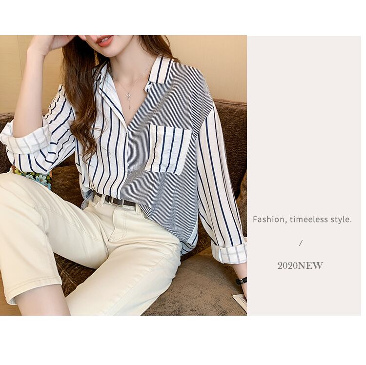 LJSXLS ポケットストライプ長袖シャツ女性ブラウス服ルーズボタンレディーストップス Chemisier 2022 春 ロング スプリング 春物 Son65917356629