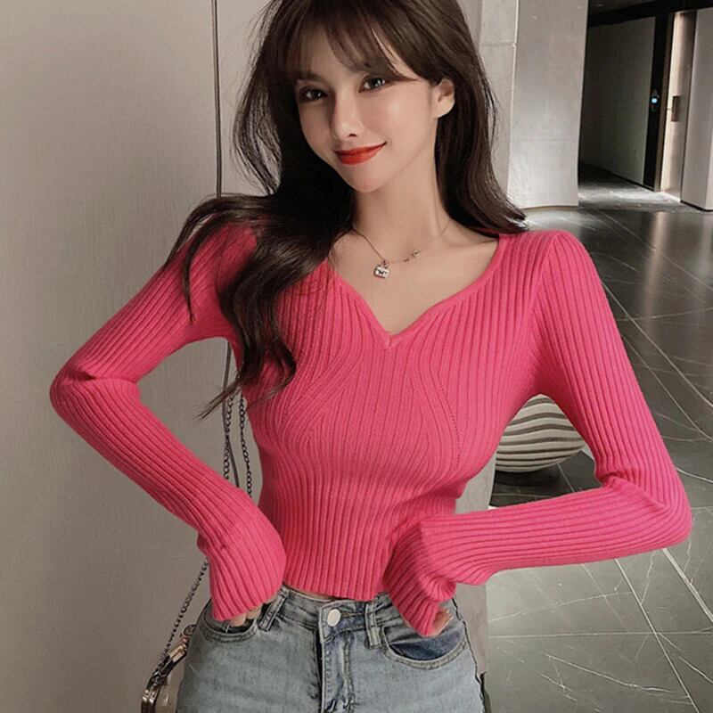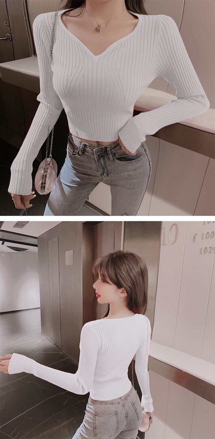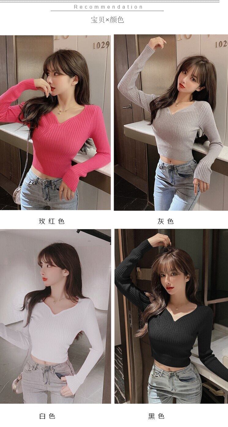 LJSXLS 女性長袖プルオーバークロップトップスニットセーター女性のセクシーな V ネックソリッドベーシックセーター 2020 秋冬 ロング オータム 秋物 ウィンター 冬物 Vネック ソリッドカラー Son23355680782