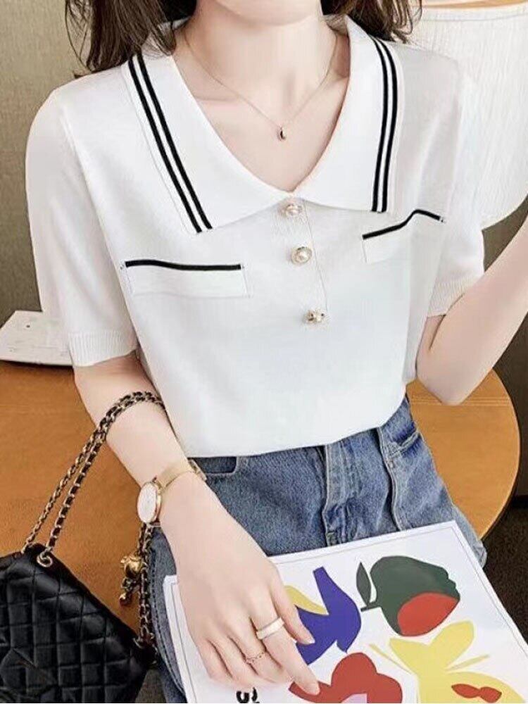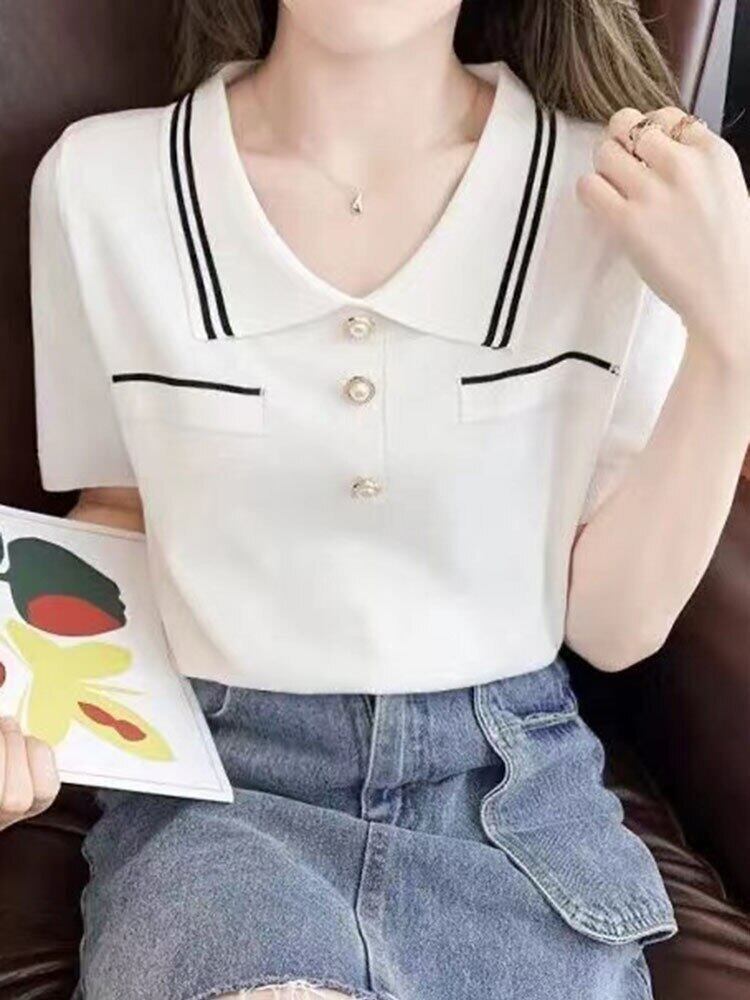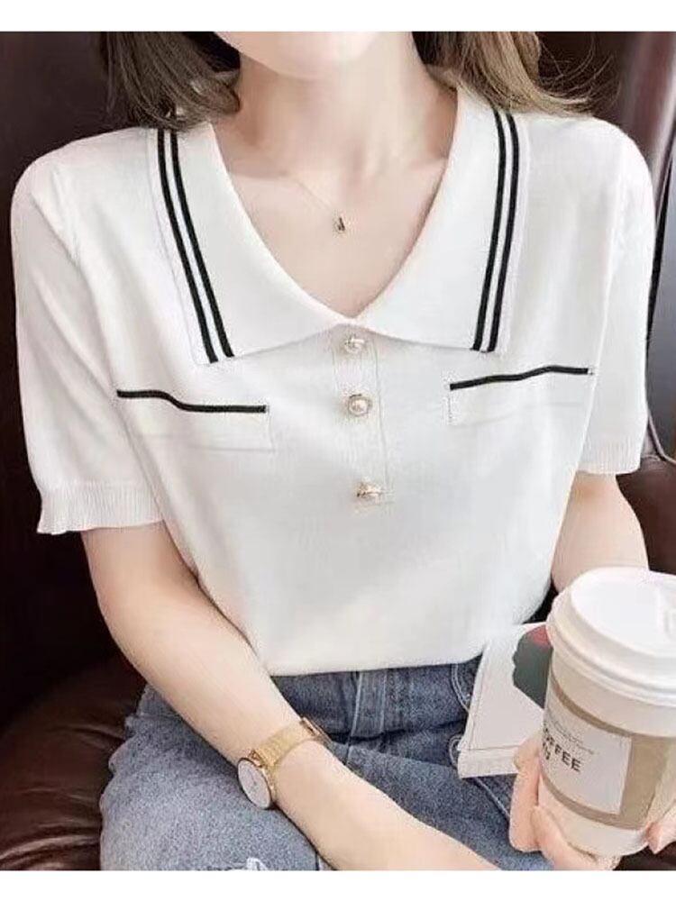 Tシャツ 2022 夏半袖トップ白ターンダウン襟 Tシャツボタンストライプ女性 Tシャツニット服 ショート ホワイト ハーフスリーブ サマー 夏物 Son14577610083