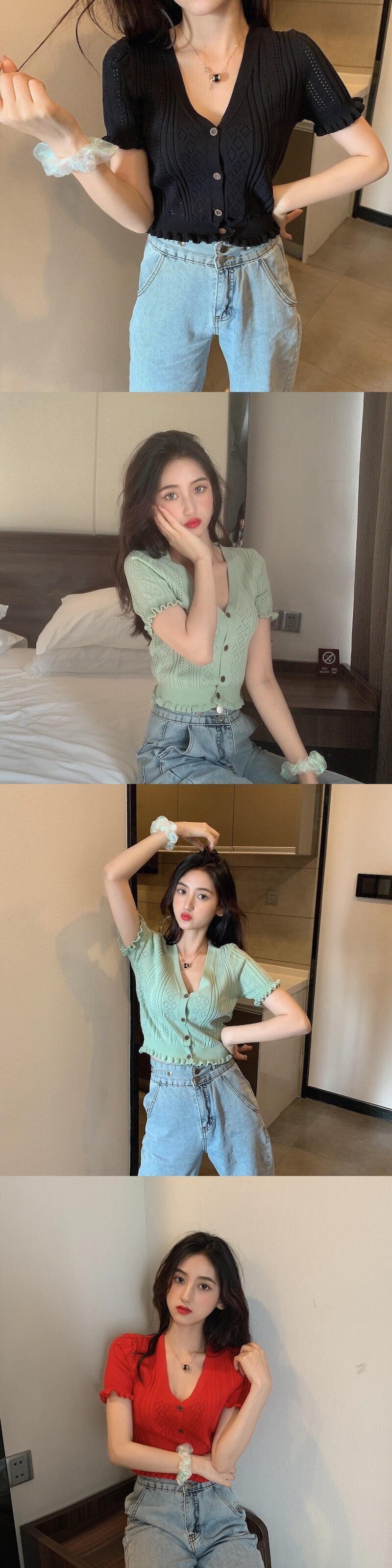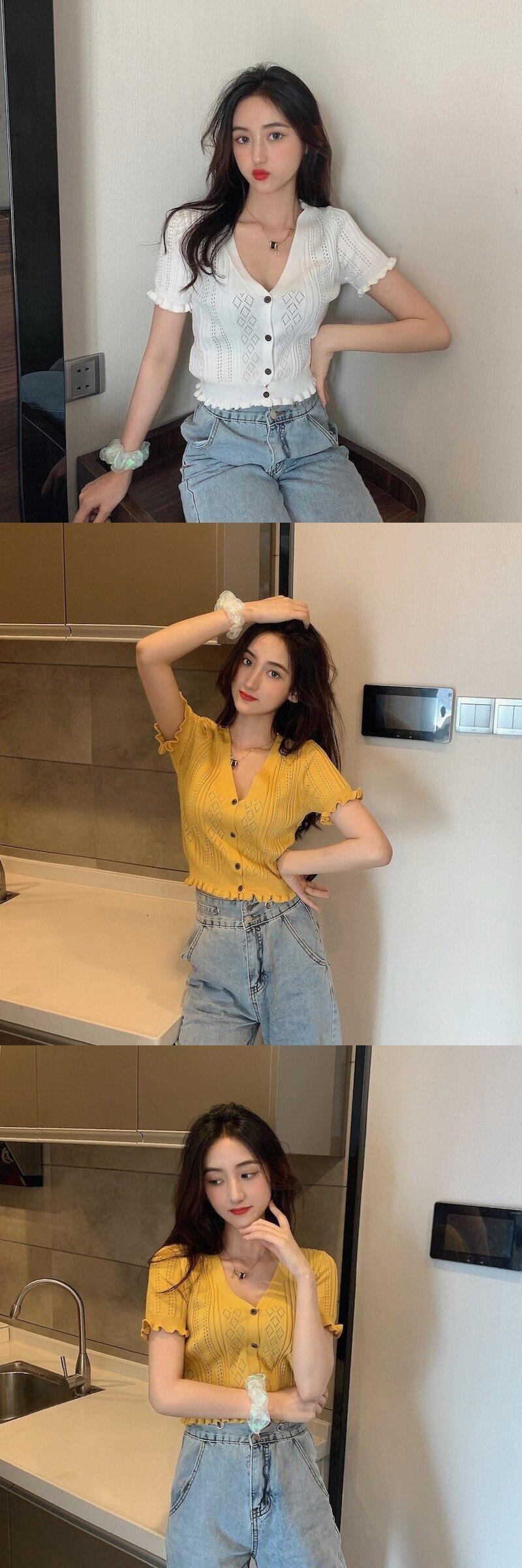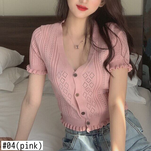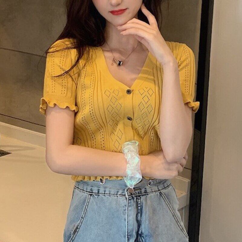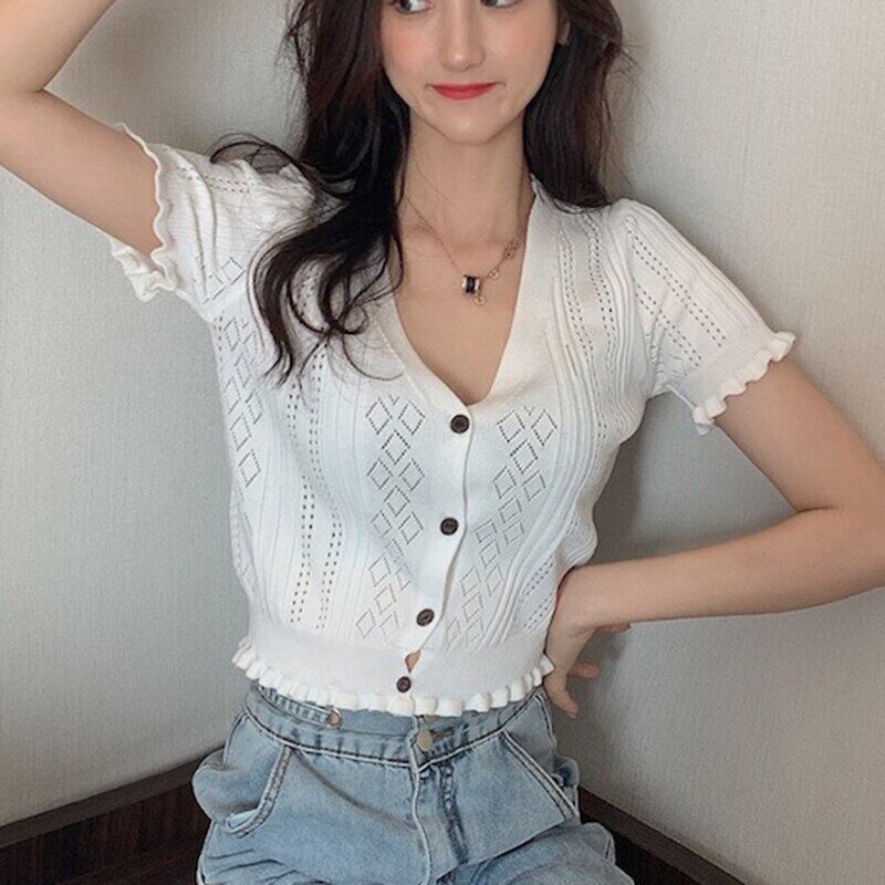 LJSXLS V ネック半袖ニットカーディガン Tシャツ女性クロップトップス夏薄い服中空アウト Tシャツ女性 Tシャツ ショート ハーフスリーブ サマー 夏物 Vネック Son19298876371