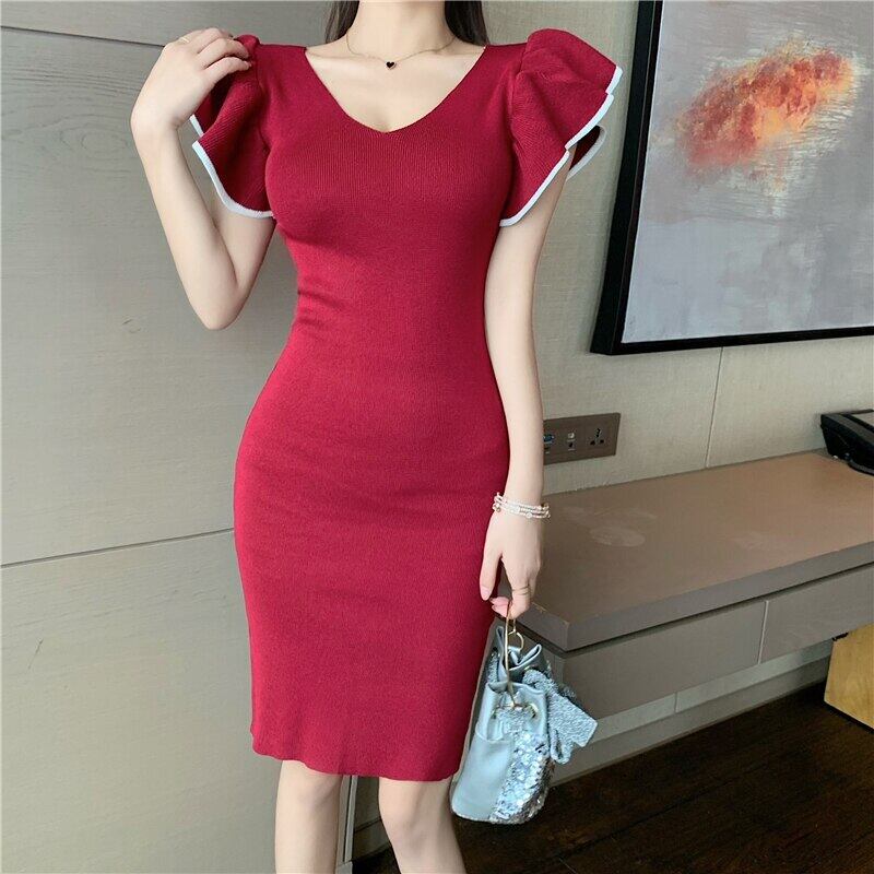 LJSXLS バタフライスリーブ女性ミニドレスセクシーな V ネック 2022 夏ボディコンニット弾性ドレス エラスティック 伸縮 サマー 夏物 Vネック Son91360326449