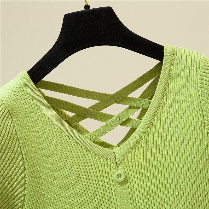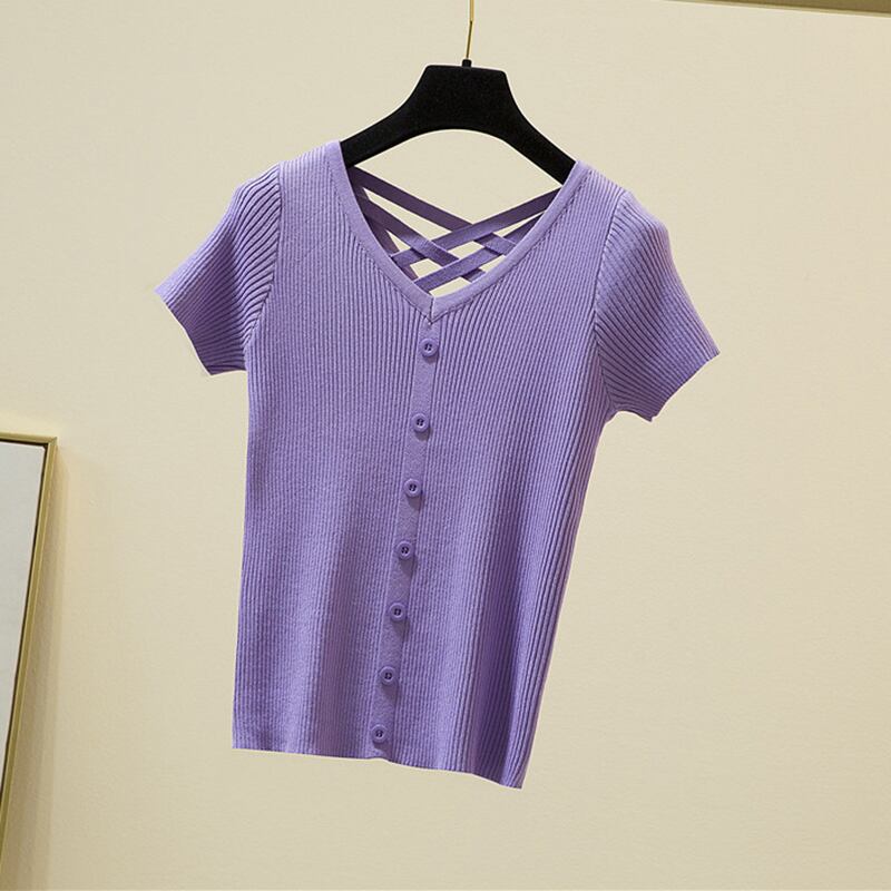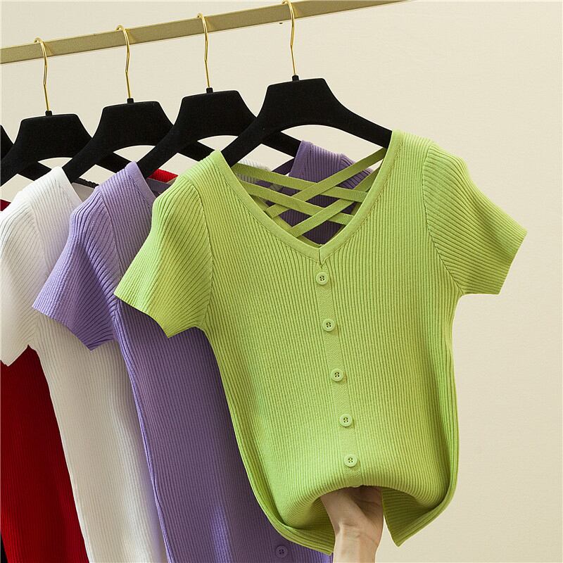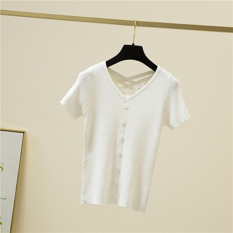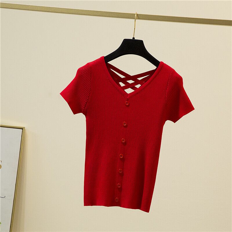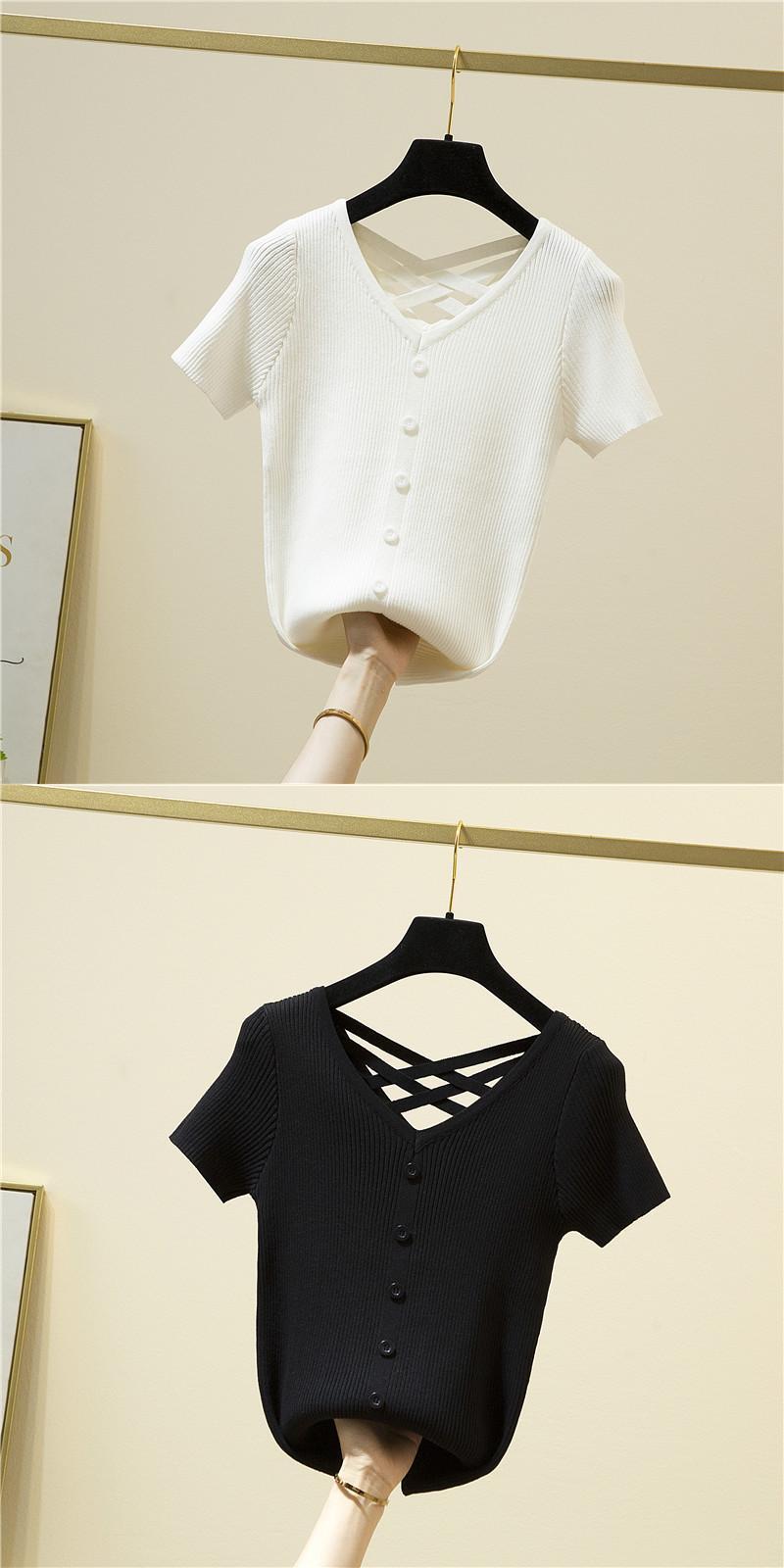 LJSXLS 夏スリムベーシック女性のセーター包帯背中の開いた V ネックの女性服ニット半袖プルオーバートップ ショート ハーフスリーブ サマー 夏物 Vネック Son89215001824