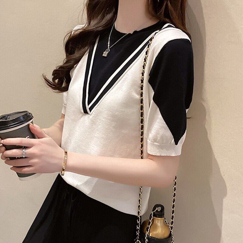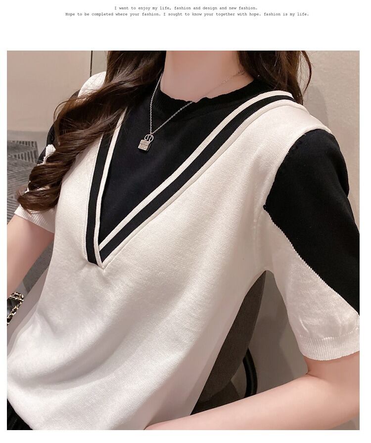Tシャツ夏ニット半袖 Tシャツ女性コントラストカラーフェイクツーピーストップス Tシャツ服 ショート ハーフスリーブ サマー 夏物 Son13498133245