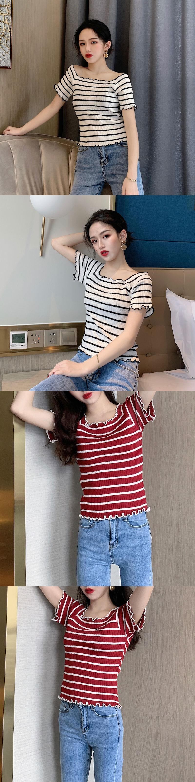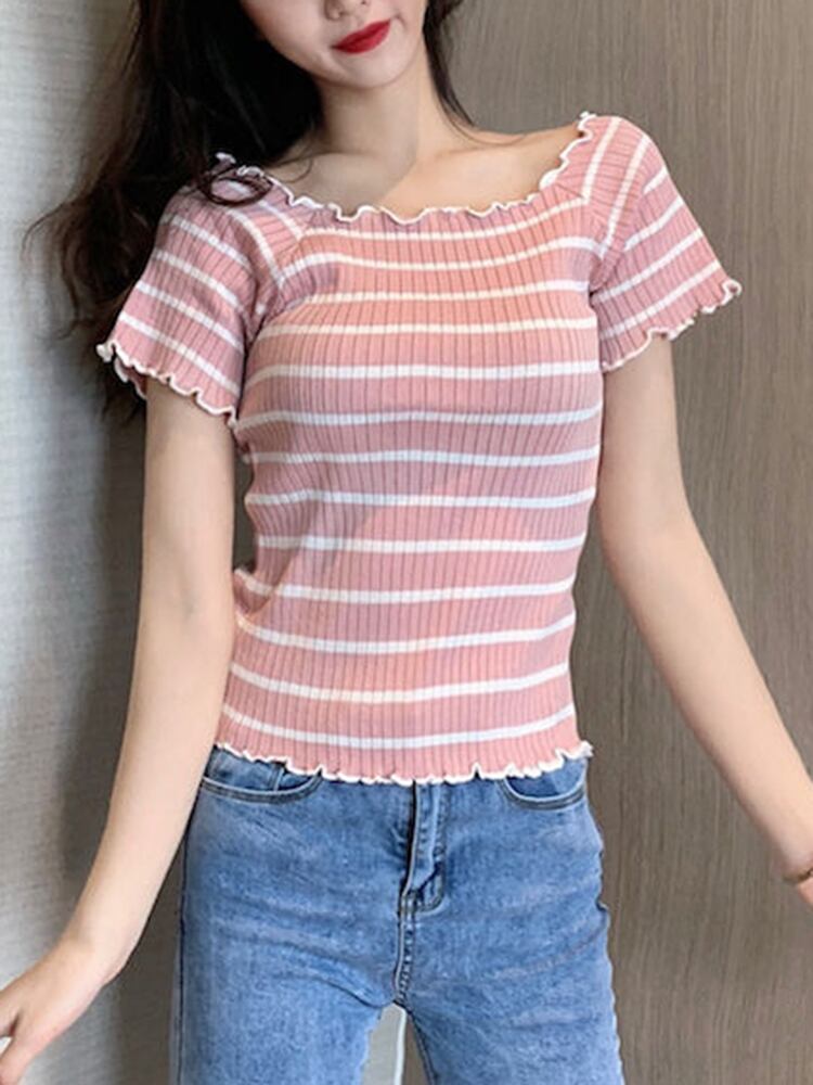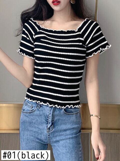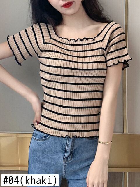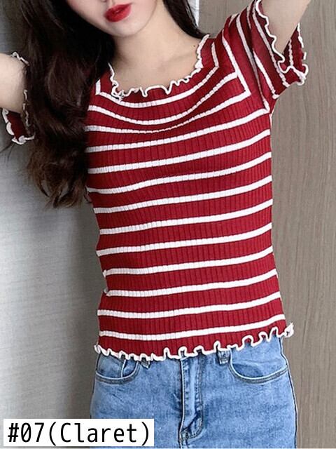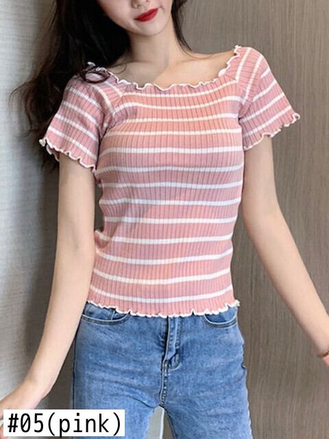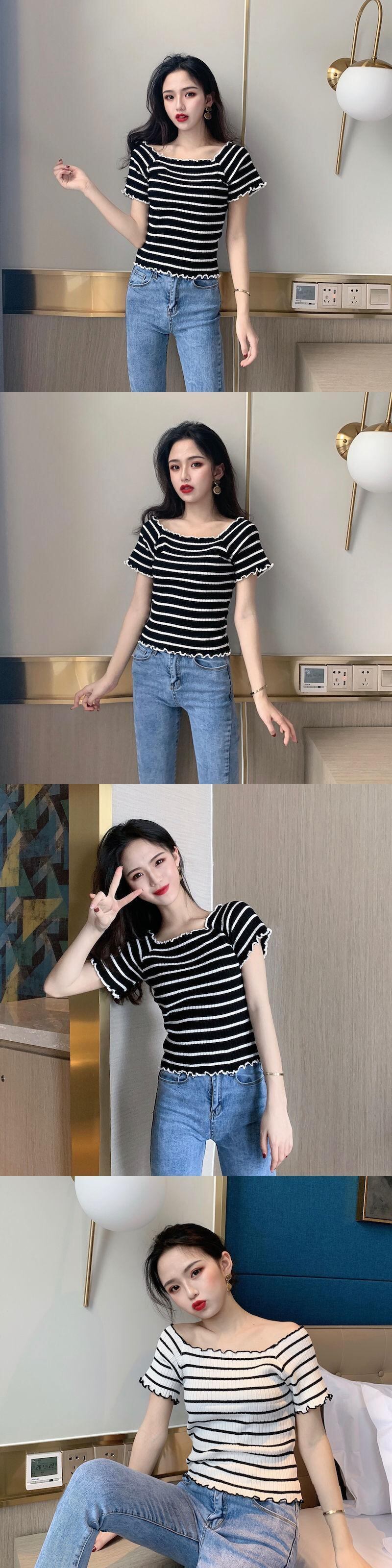 Camiseta ストライプクロップ T 女性 Tシャツ 2022 夏ニットトップス半袖 Tシャツスクエアカラースリム弾性服 ショート ハーフスリーブ エラスティック 伸縮 サマー 夏物 スクウェア Son77437767362