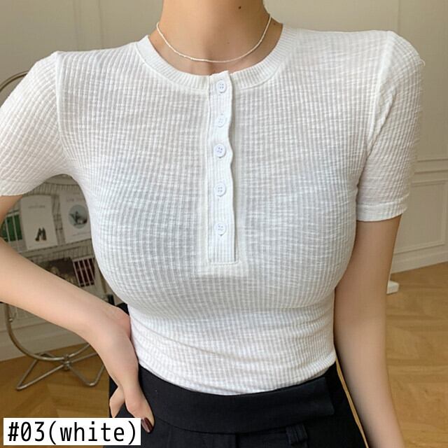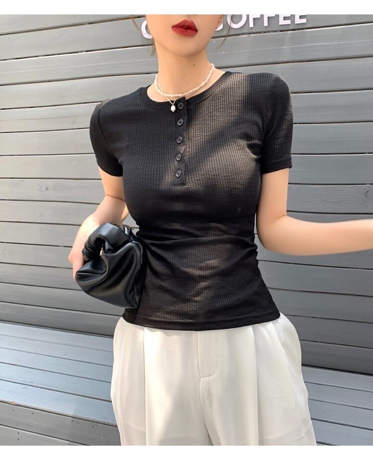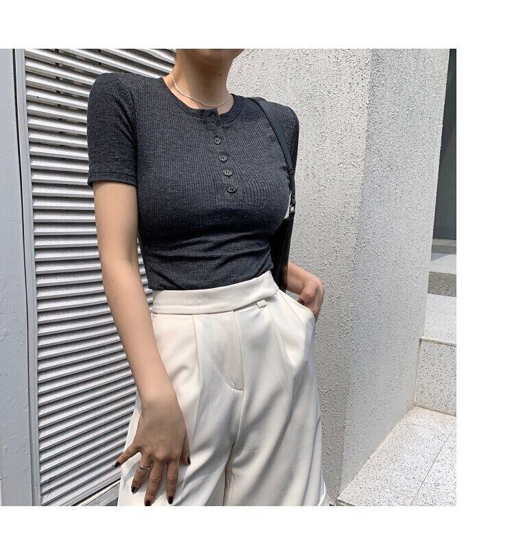 LJSXLS セクシーなスリム Tシャツ女性 2023 夏トップスタイルボタン半袖 Tシャツ女性服弾性 Tシャツ ショート ハーフスリーブ エラスティック 伸縮 サマー 夏物 Son75455869140