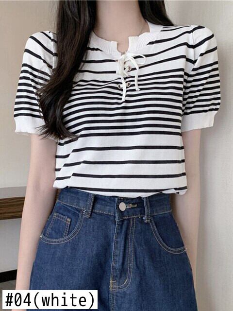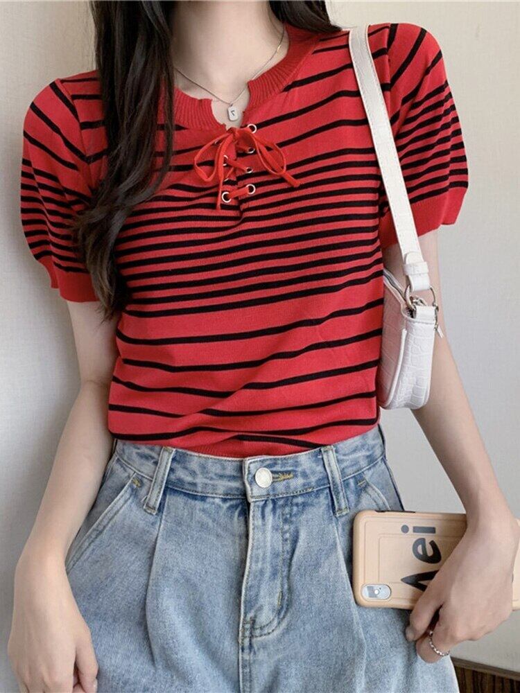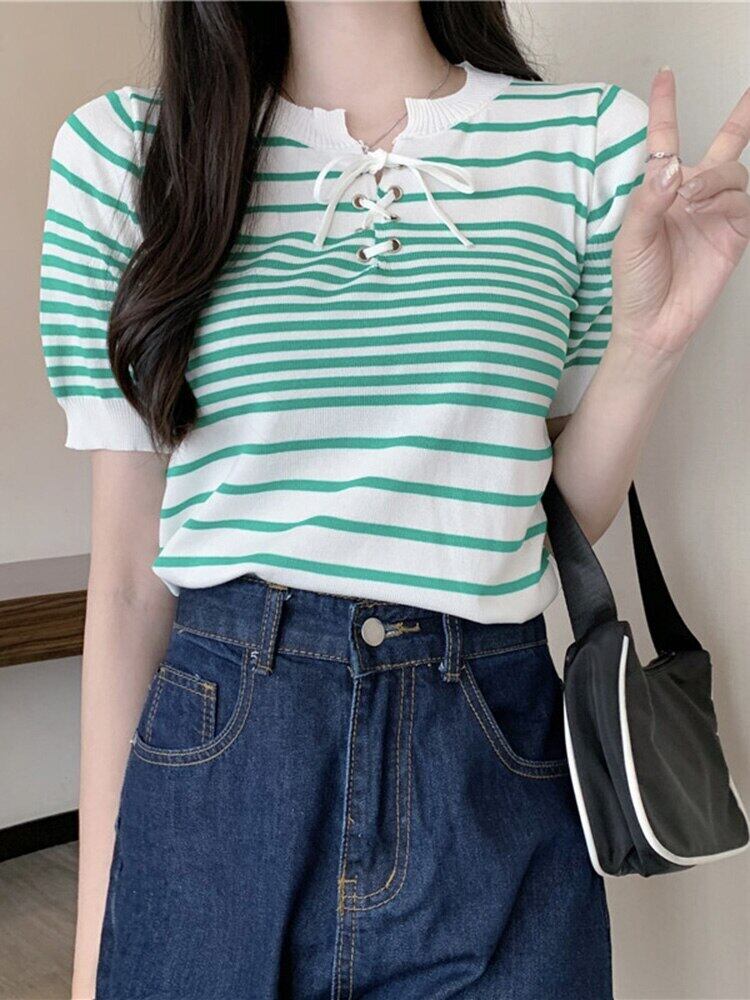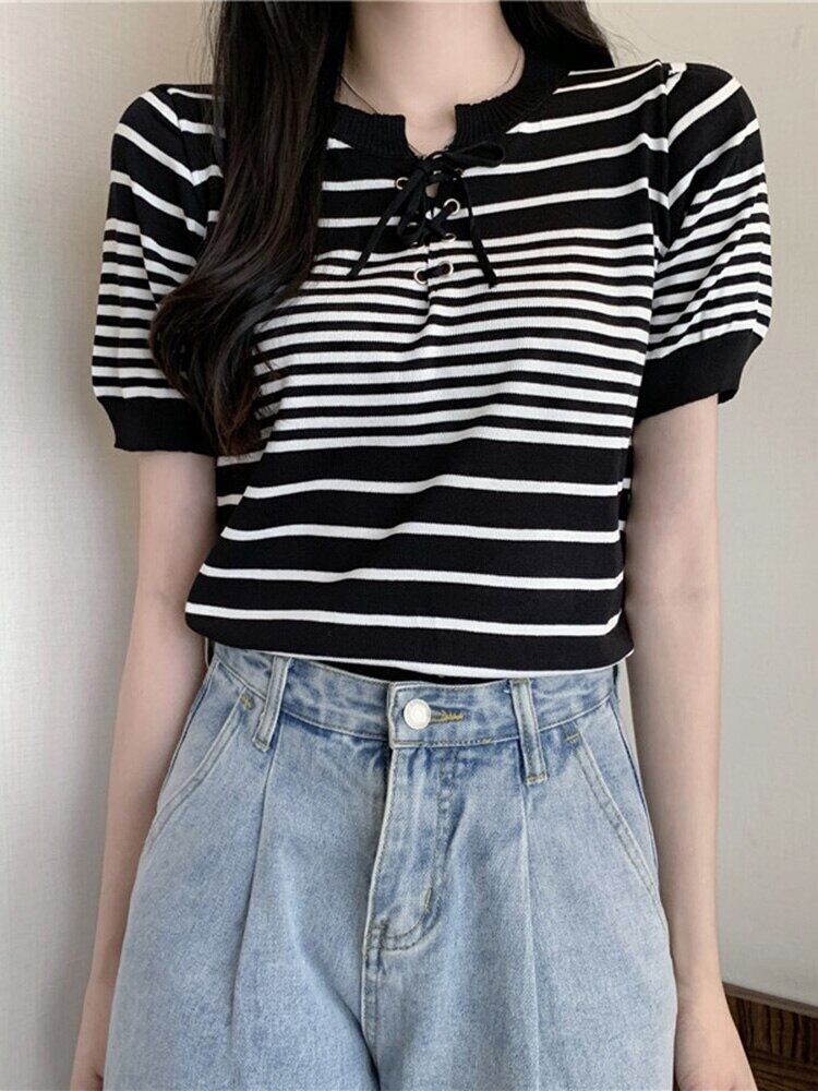 ストライプ Tシャツ女性ホワイトレースアップクロップトップ 2022 夏の女性半袖 Tシャツニット Tシャツ Haut ショート ハーフスリーブ サマー 夏物 Son76015935833