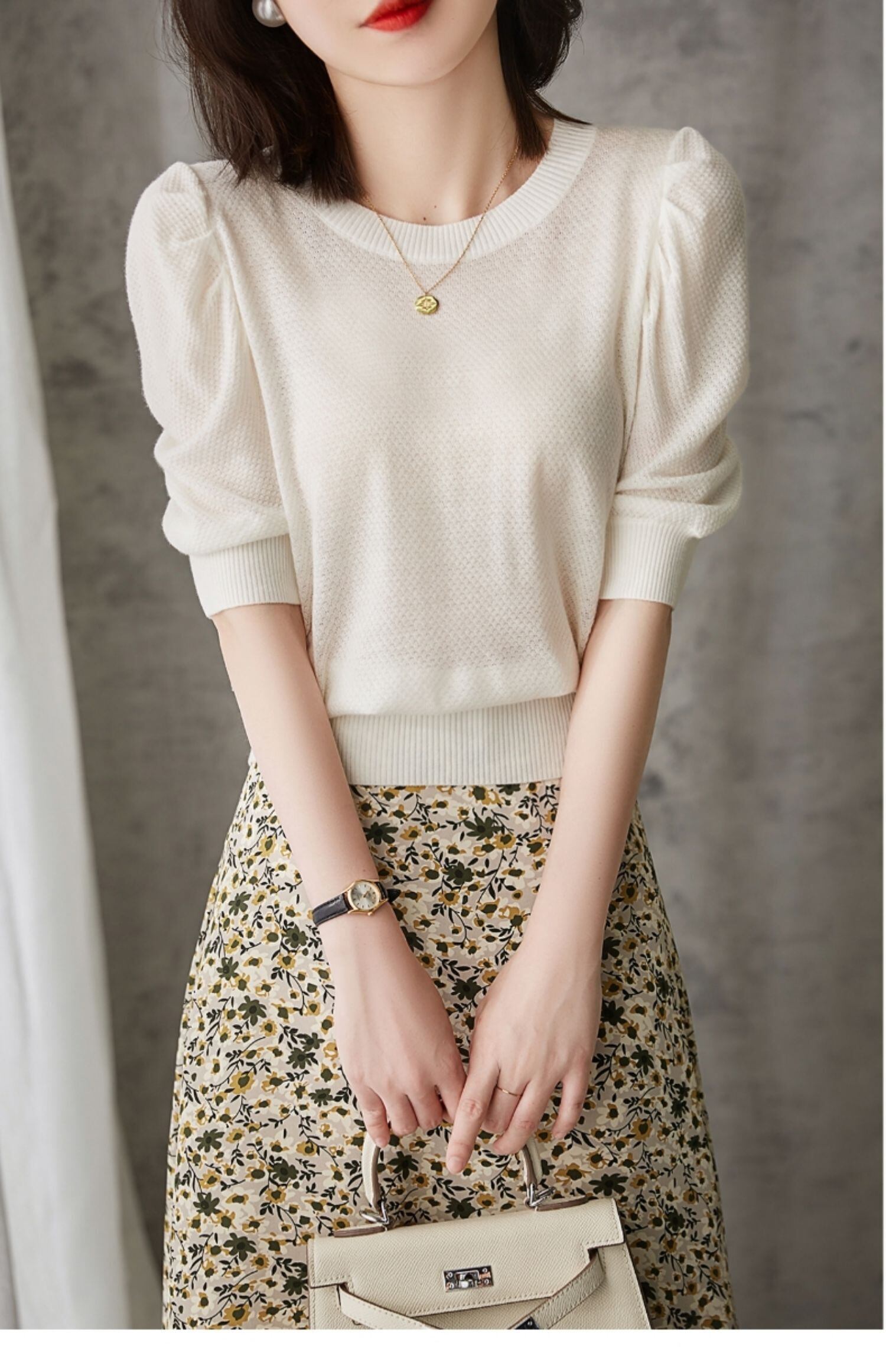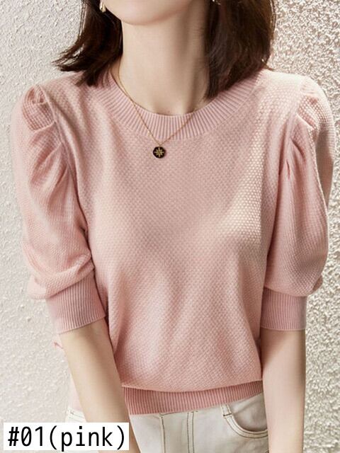 白 Tシャツパフ半袖ニットレディース 2022 夏服女性アイスシルク薄ピンクトップス Camisetas デ ショート ホワイト ハーフスリーブ サマー 夏物 Son4181460317