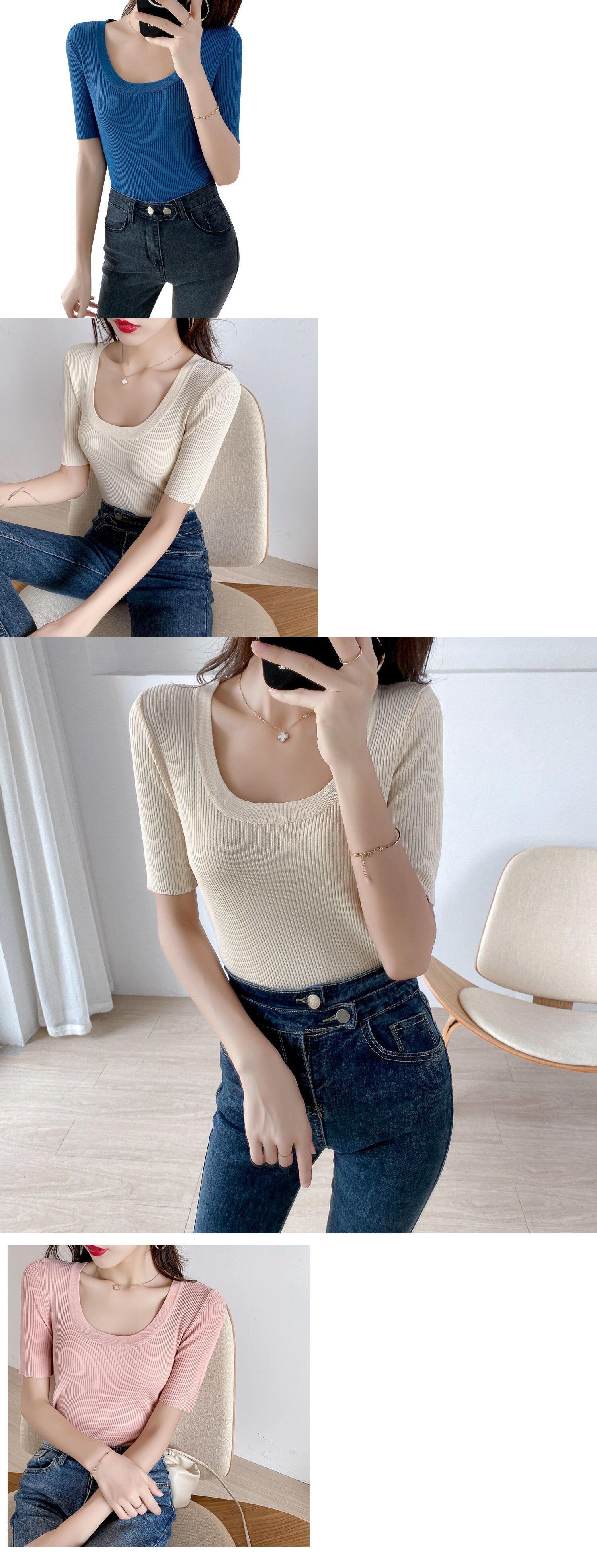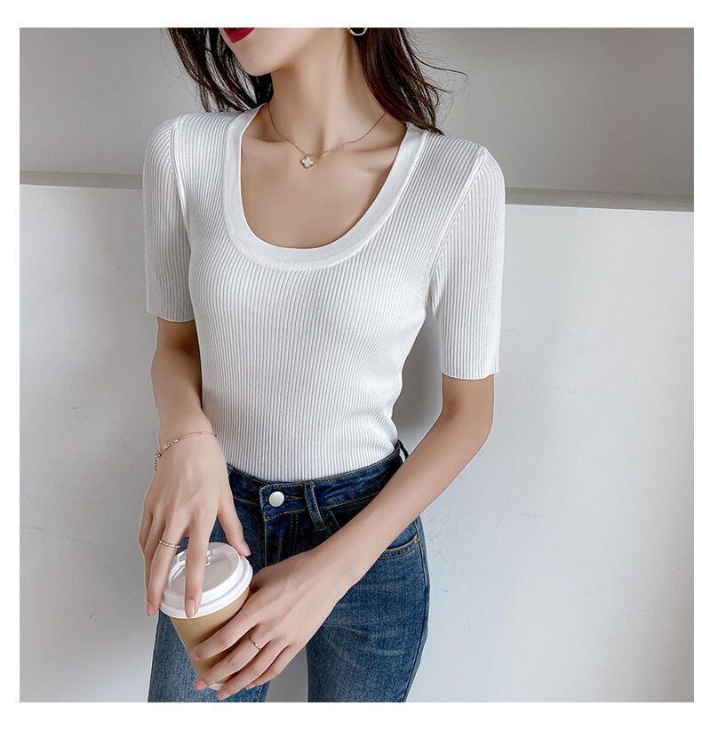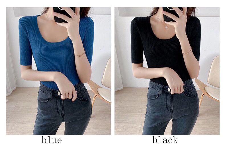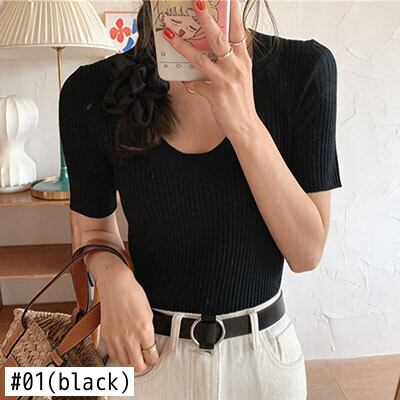LJSXLS 黒、白夏の基本的なニット Tシャツ女性 2021 弾性半袖 Tシャツセクシーなスリムトップス ショート ホワイト ブラック ハーフスリーブ エラスティック 伸縮 サマー 夏物 Son93454471471