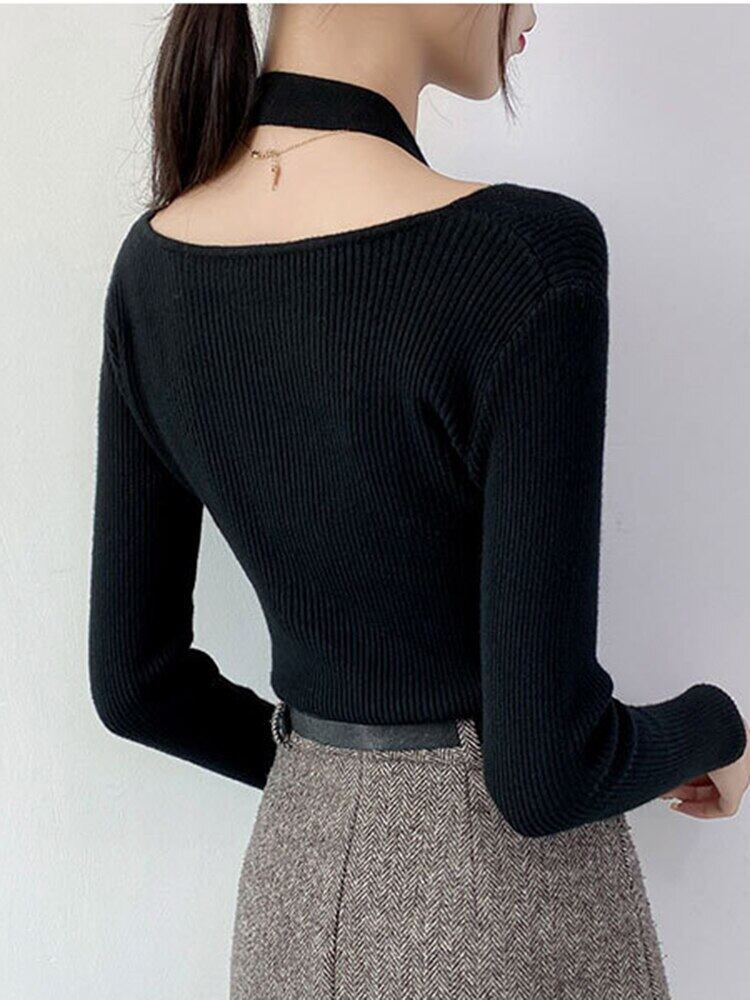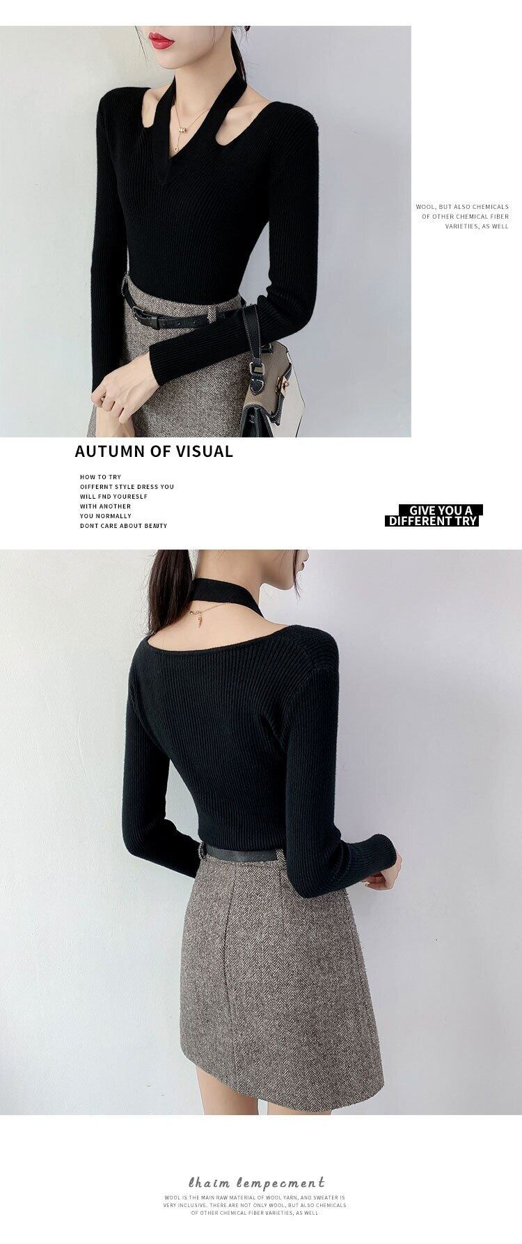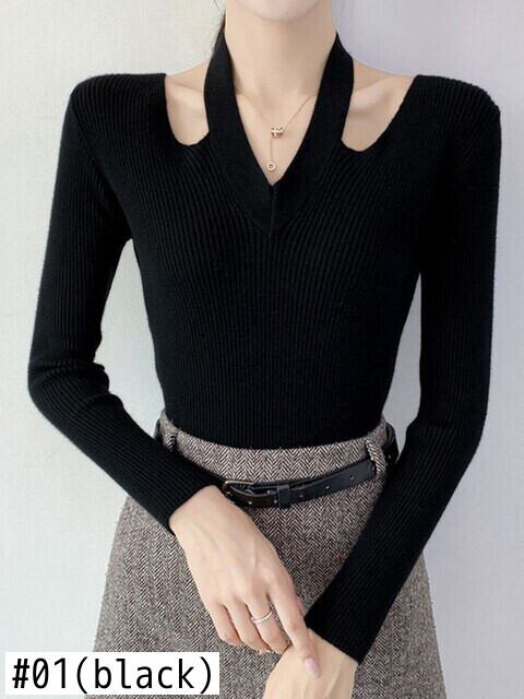 黒ニットセーターセクシーな中空アウトセーター女性 2022 秋冬服ホルター V ネック長袖トップスリムプルオーバー女性 ロング ブラック オータム 秋物 ウィンター 冬物 Vネック Son2876737674