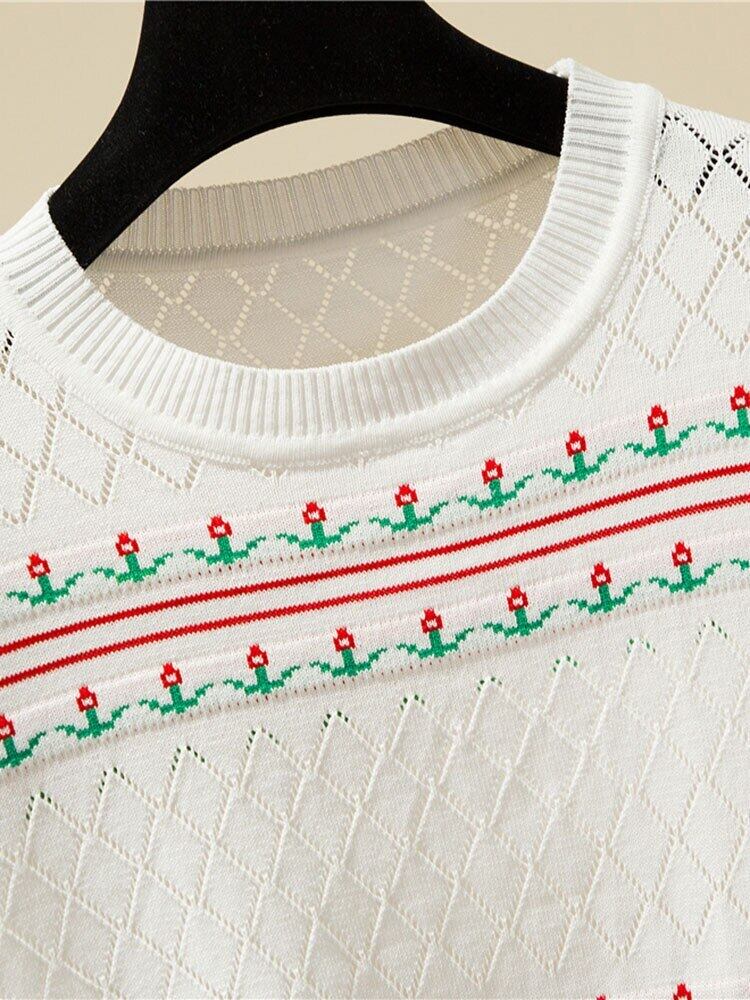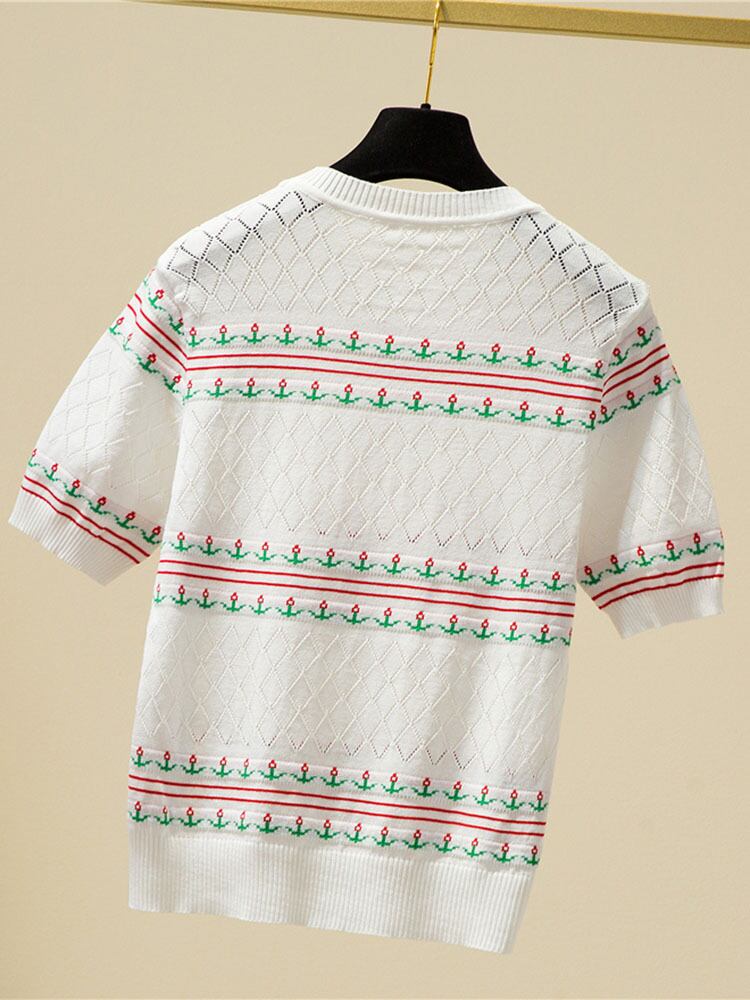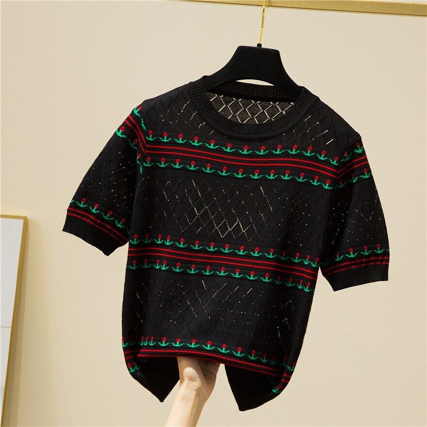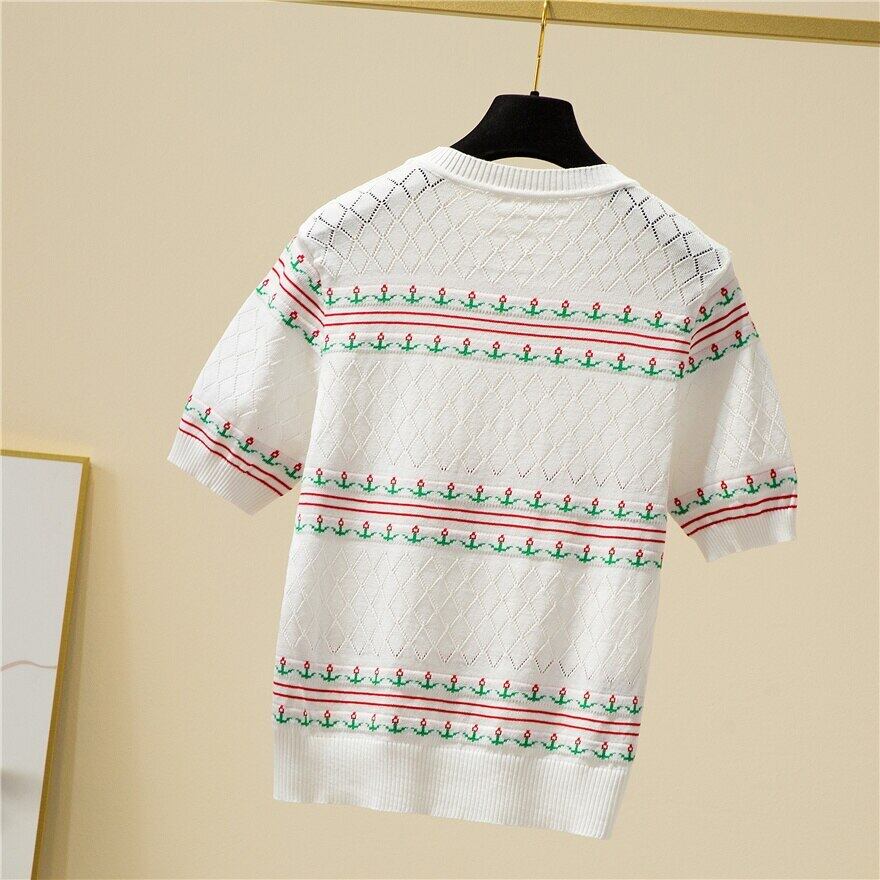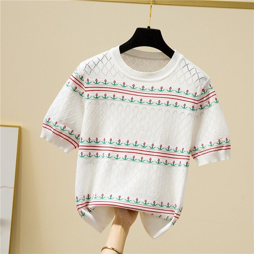 O ネックルーズ刺繍薄いセーター女性中空アウト半袖ニットトッププルオーバーレディース 2022 夏 ショート ハーフスリーブ サマー 夏物 Son627999515