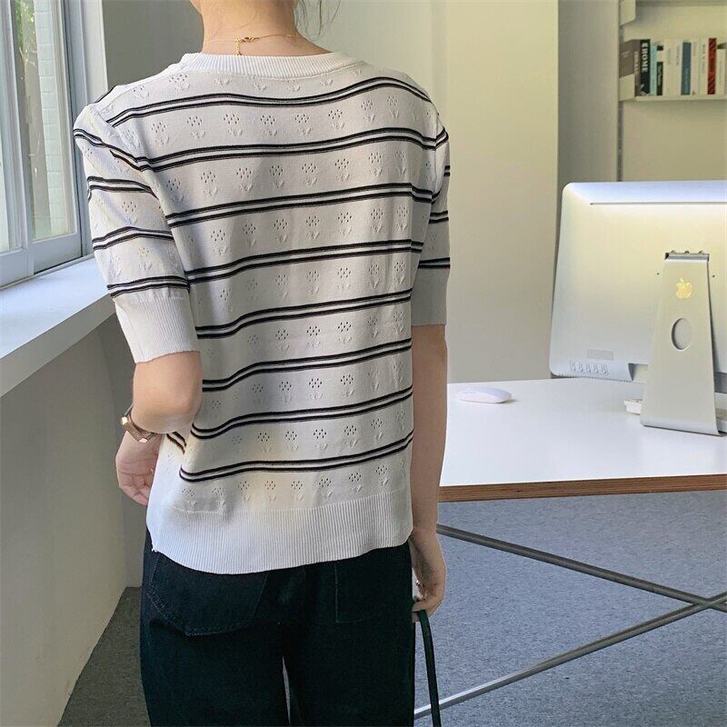 ブルーストライプニットセーター女性 2022 夏 O ネック半袖トップルーズプルオーバーセーターレディースセーターデ ショート ハーフスリーブ サマー 夏物 Oネック Son95477930868