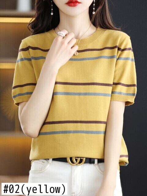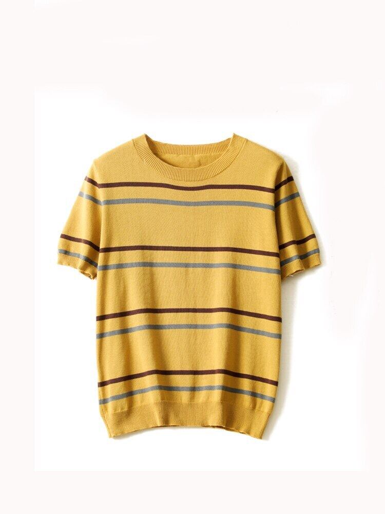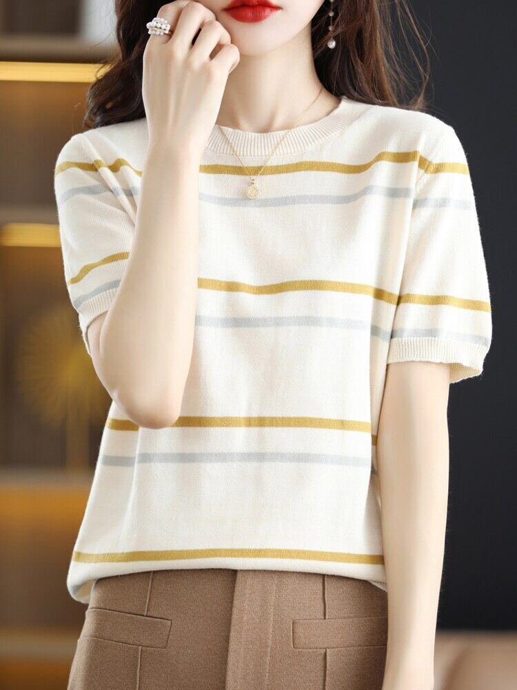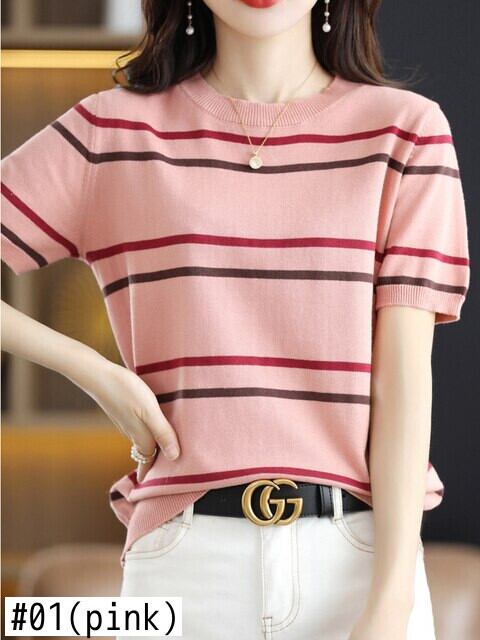 ストライプニットセーターピンクトップ 2022 夏対照的な色のセーターの女性半袖プルオーバープル ショート ハーフスリーブ サマー 夏物 Son31555140414