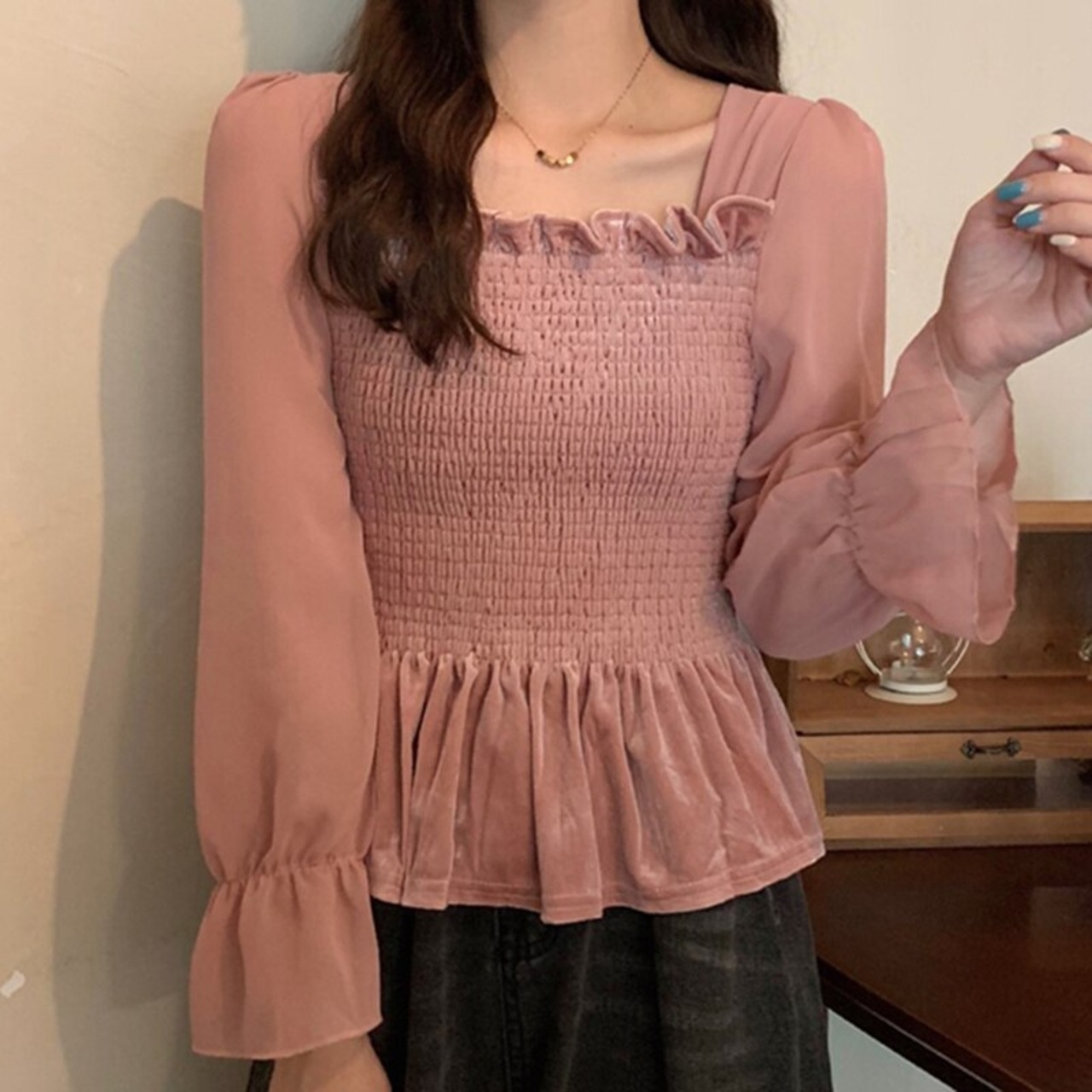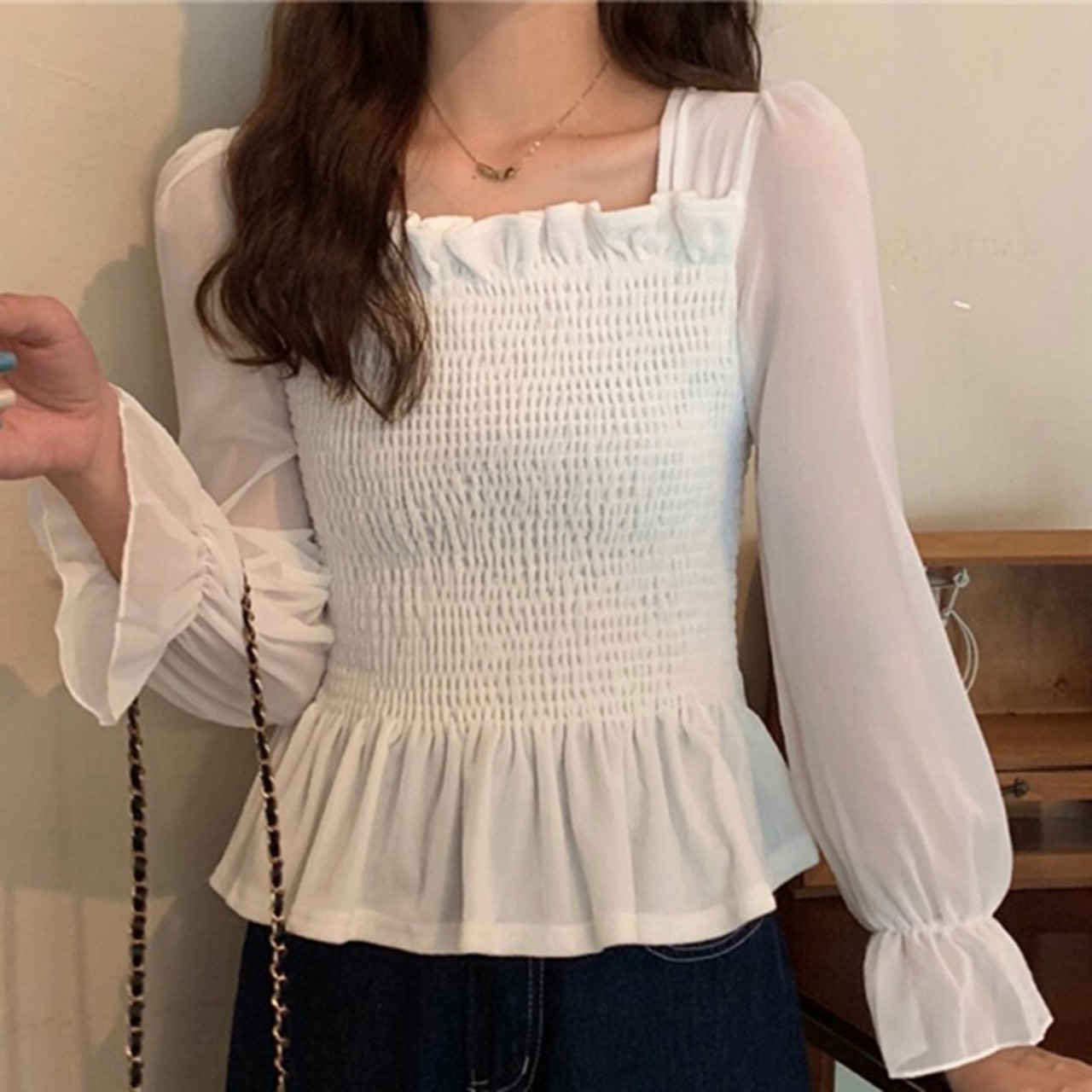 LJSXLS 2022 秋スクエアカラースリム白シャツ女性のセクシーな長袖パッチワークブラウス婦人服 ロング ホワイト オータム 秋物 スクウェア Son54656626630