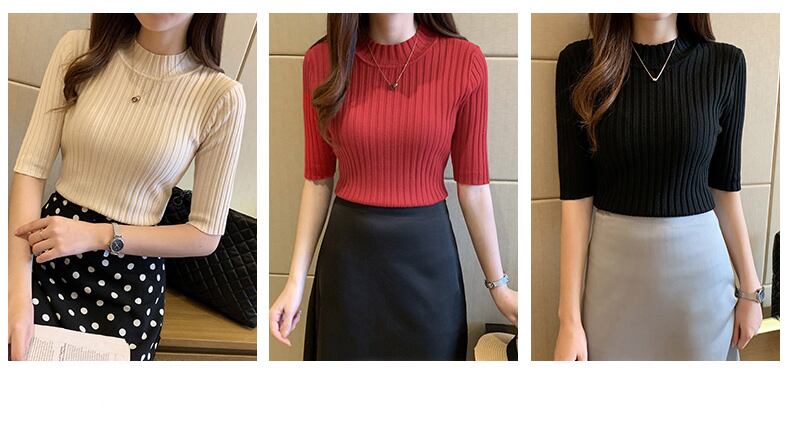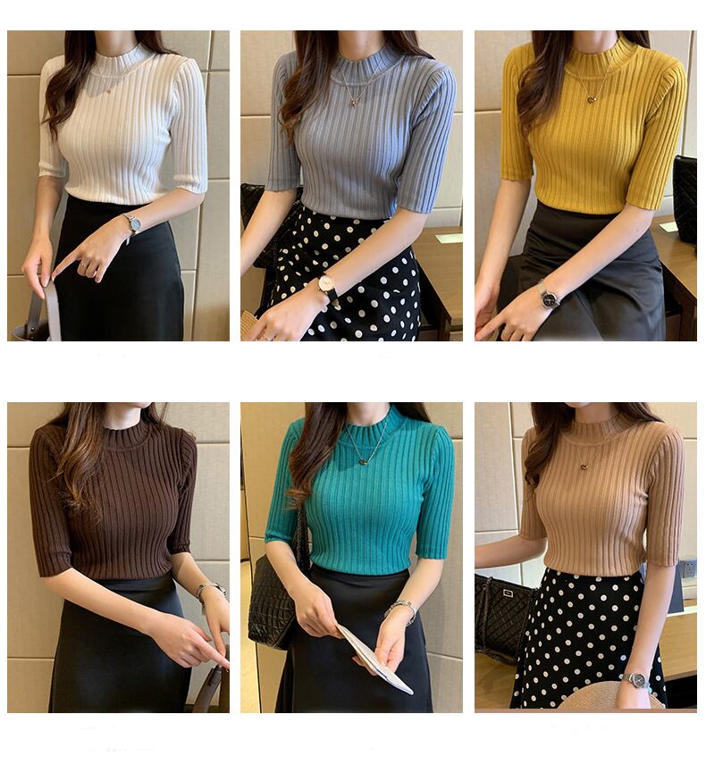 LJSXLS 春無地プルオーバーリブニットセーター秋の女性服 O ネック半袖ベーシックスリムセーター ハーフスリーブ スプリング 春物 オータム 秋物 Oネック ソリッドカラー Son75609988609