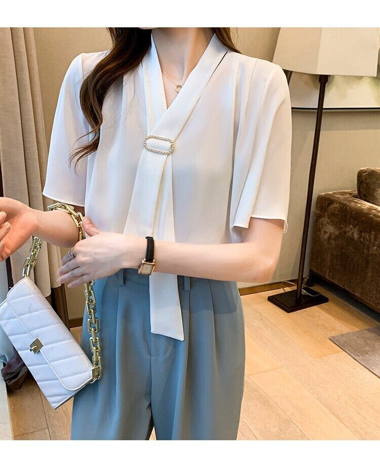 シフォンブラウス夏 2022 女性シャツレース V ネック半袖トップオフィスレディホワイトデ ショート ハーフスリーブ サマー 夏物 Vネック 会社 学校 通勤や通学にも Son31756522151