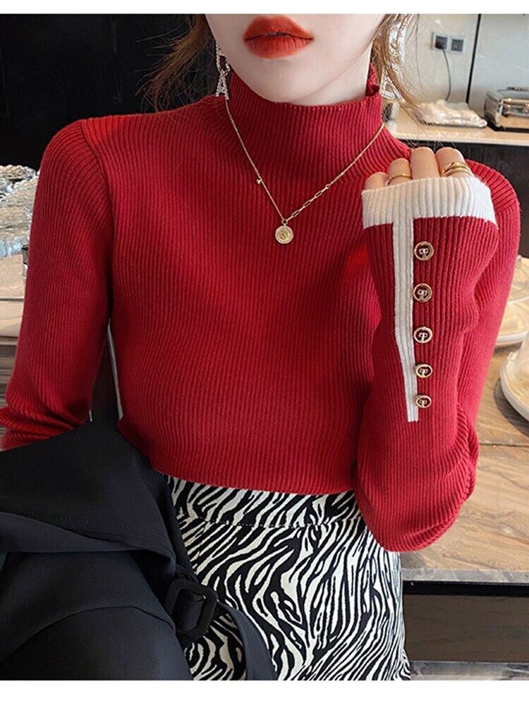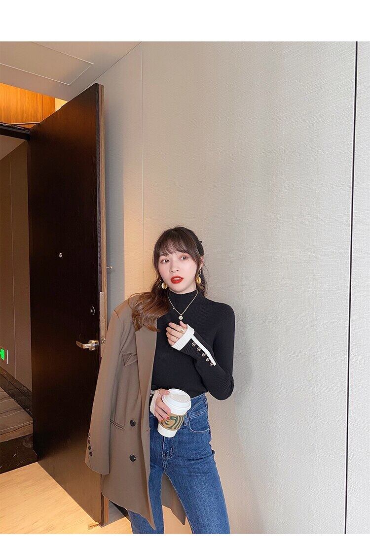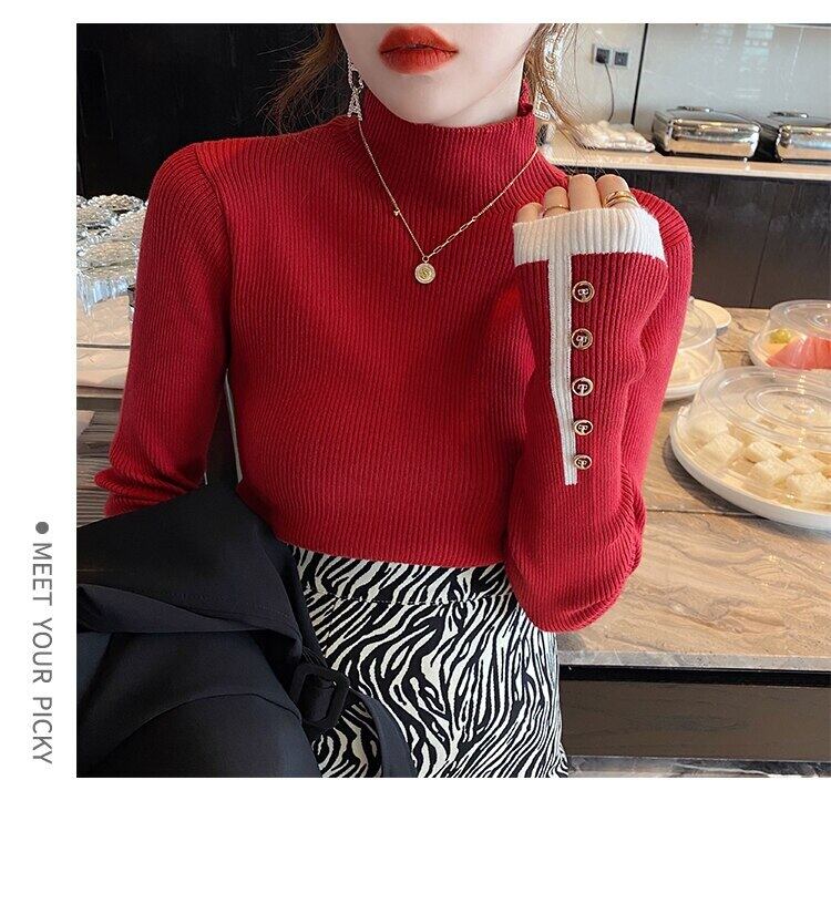タートルネックの女性のセーターニットプルオーバーセーターボタン長袖トップスリム弾性服 2022 秋冬プル ロング エラスティック 伸縮 オータム 秋物 ウィンター 冬物 Son91411693589