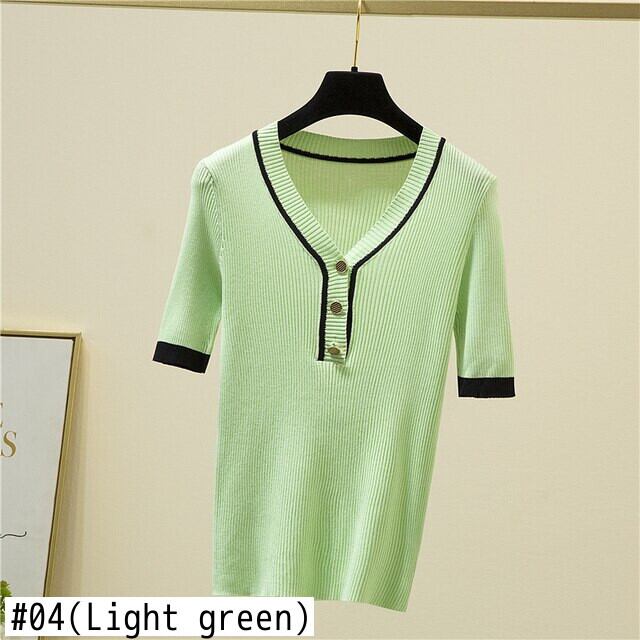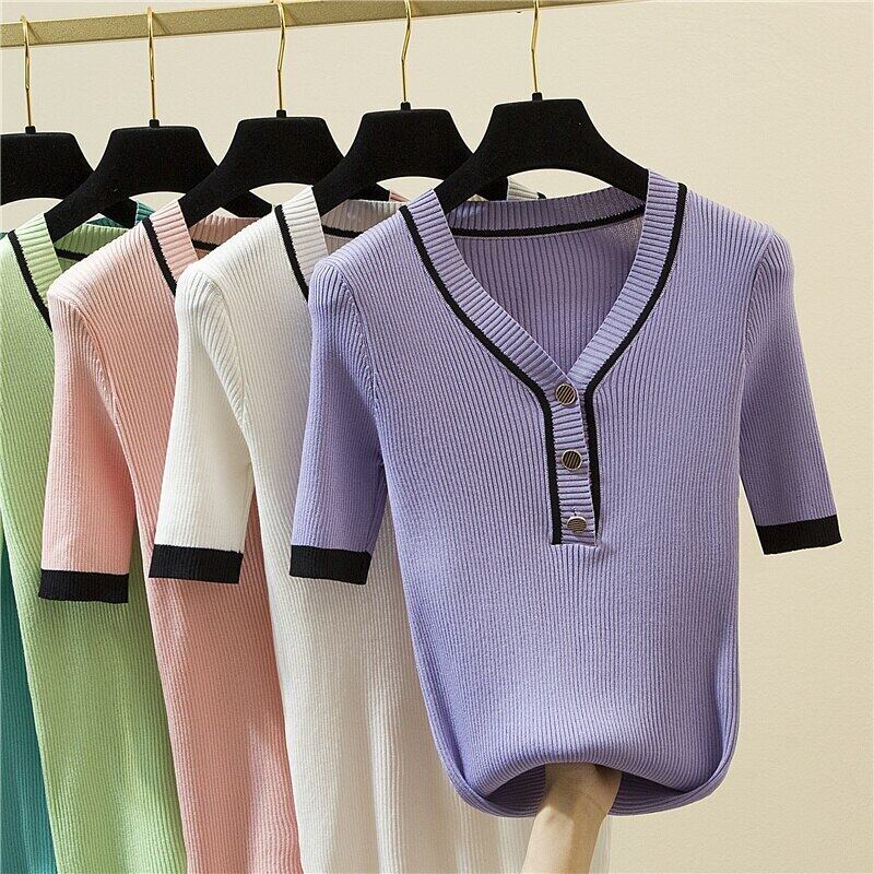 LJSXLS 夏 V ネック半袖セーター女性カラーコントラストボタンプルオーバートップスパープルスリムニット女性のセーター 2021 ショート ハーフスリーブ サマー 夏物 Vネック Son21047432721