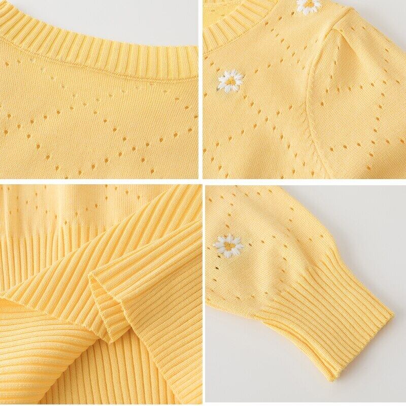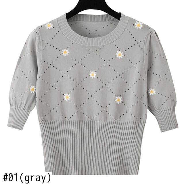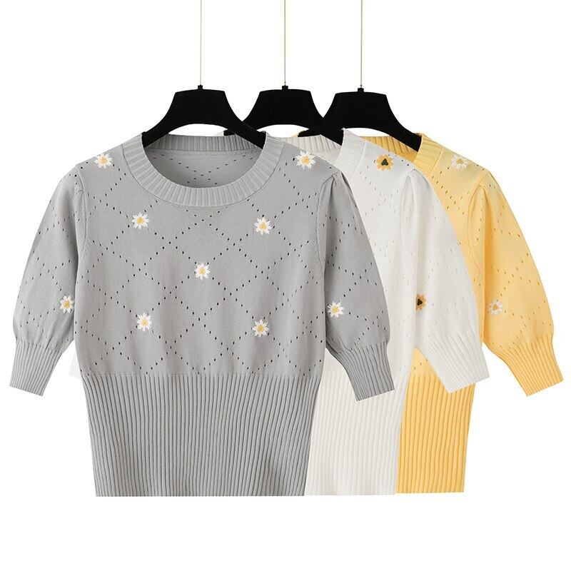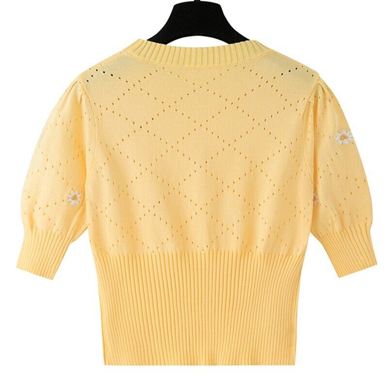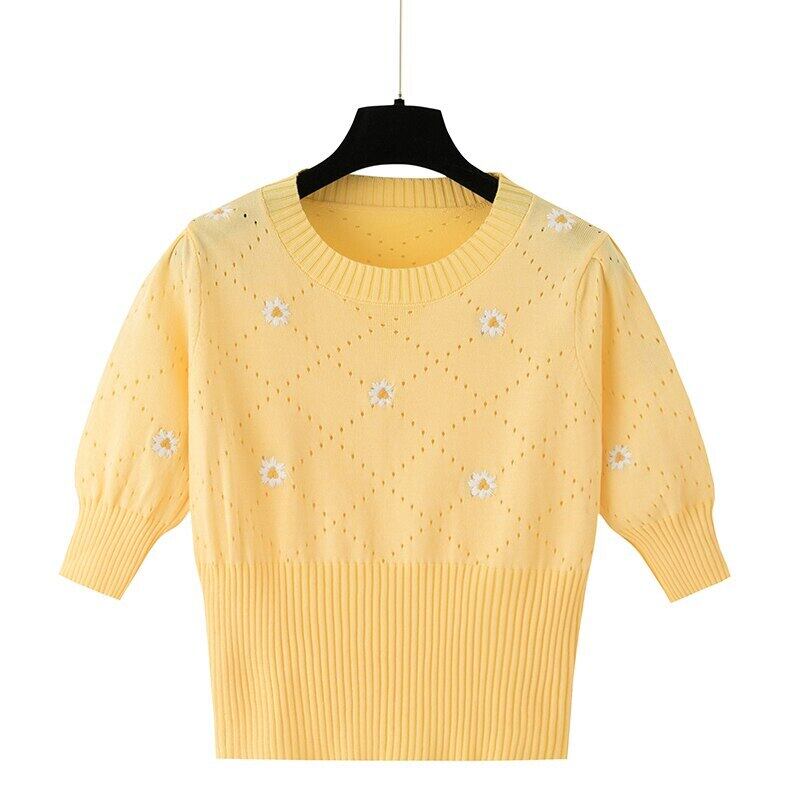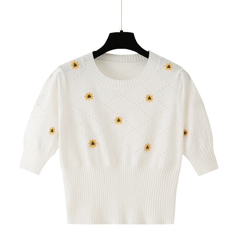 LJSXLS 刺繍クロップトップニットセーター女性 2021 夏中空アウトセーター半袖プルオーバー女性服 ショート ハーフスリーブ サマー 夏物 Son10081317251