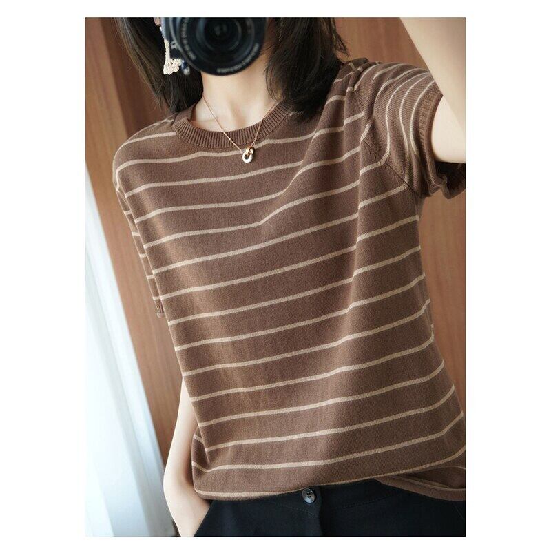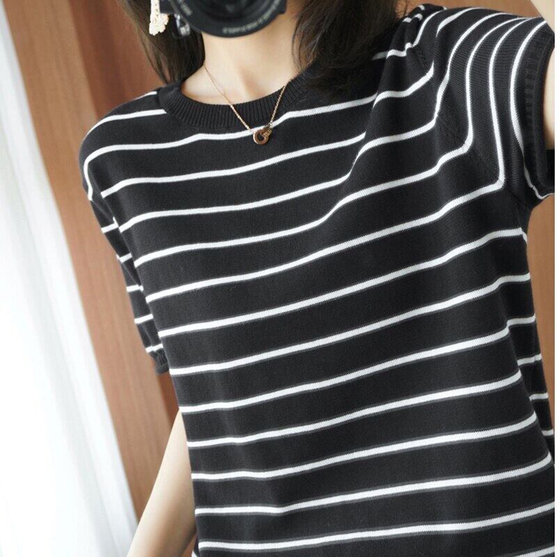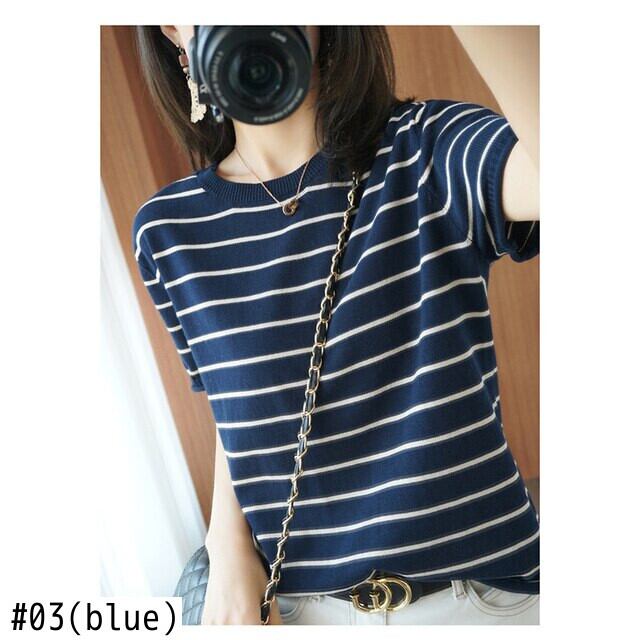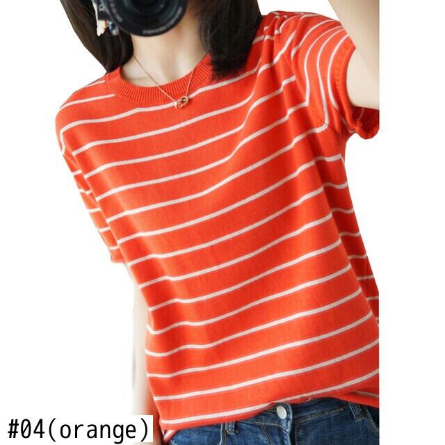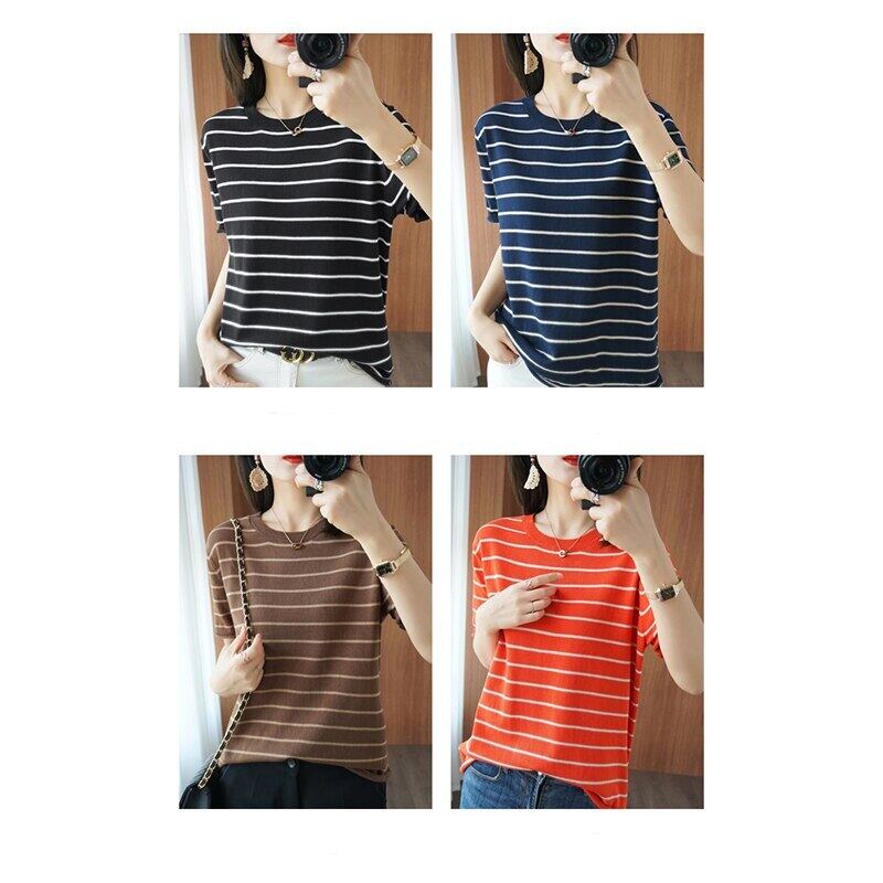 LJSXLS プル 2021 半袖ストライプニットセーター女性の夏のプルオーバートップ O ネックレディース ショート ハーフスリーブ サマー 夏物 Oネック Son66624096604