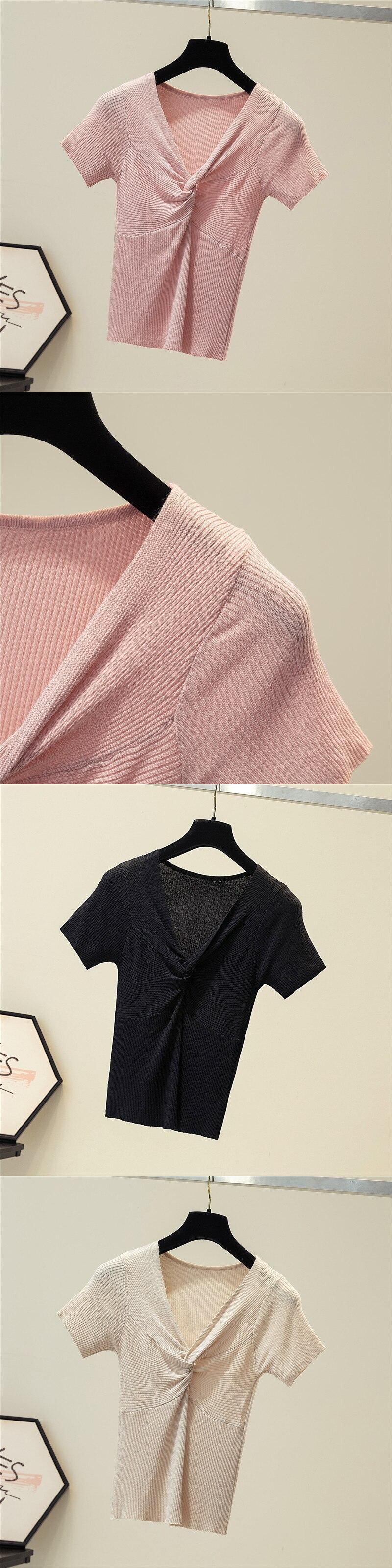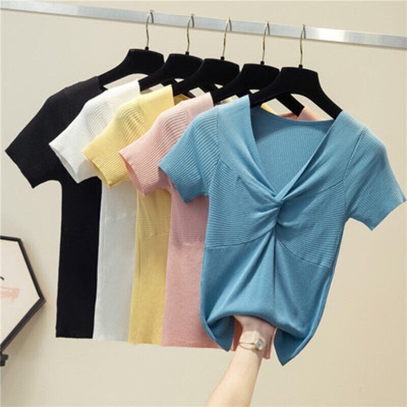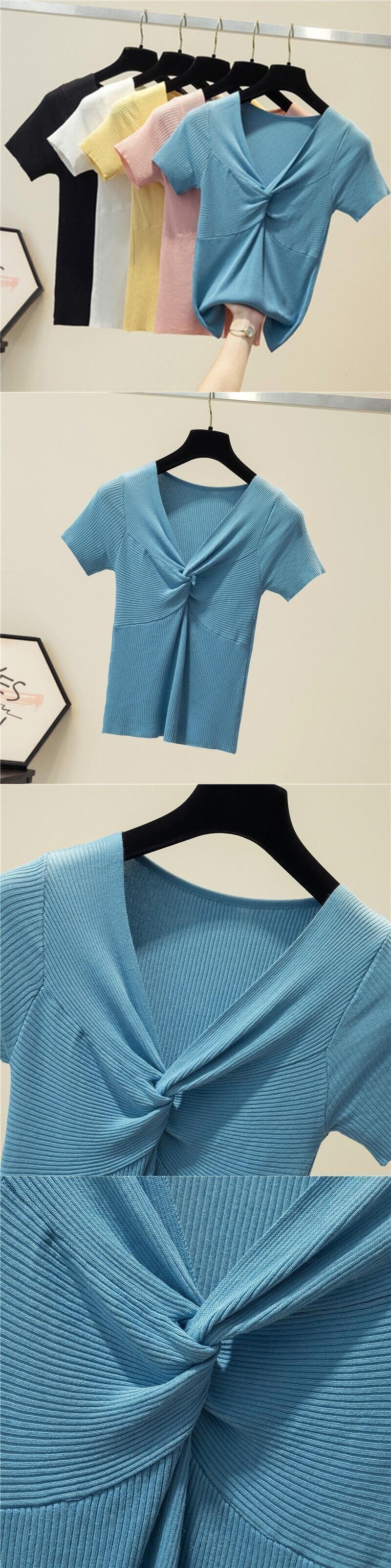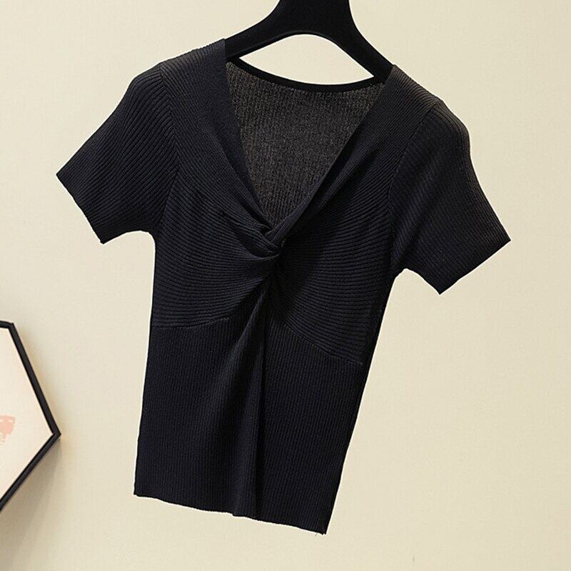 LJSXLS ニットセータートップス女性のセクシーな V ネッククロスプルオーバー半袖セーター女性黒青スリム服 ショート ブルー ブラック ハーフスリーブ Vネック Son4558035644