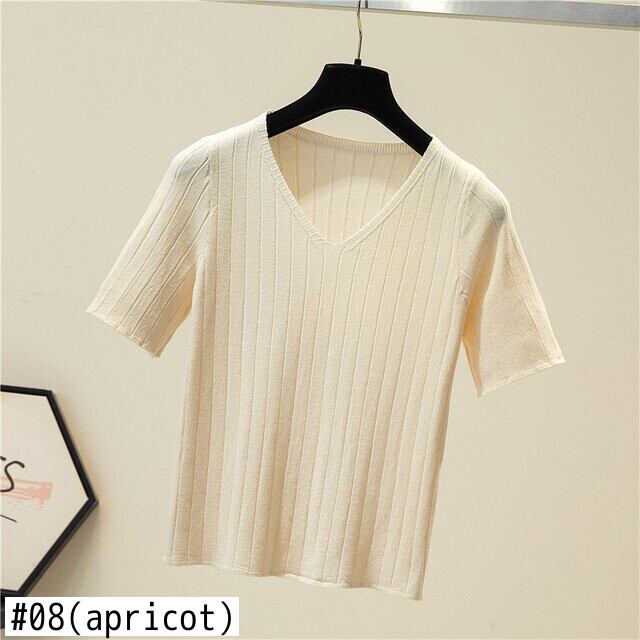 LJSXLS 弾性ソフト V ネックニットトップ 2021 夏レディース半袖プルオーバーソリッドベーシックセーター ショート ハーフスリーブ エラスティック 伸縮 サマー 夏物 Vネック ソリッドカラー Son6969949120