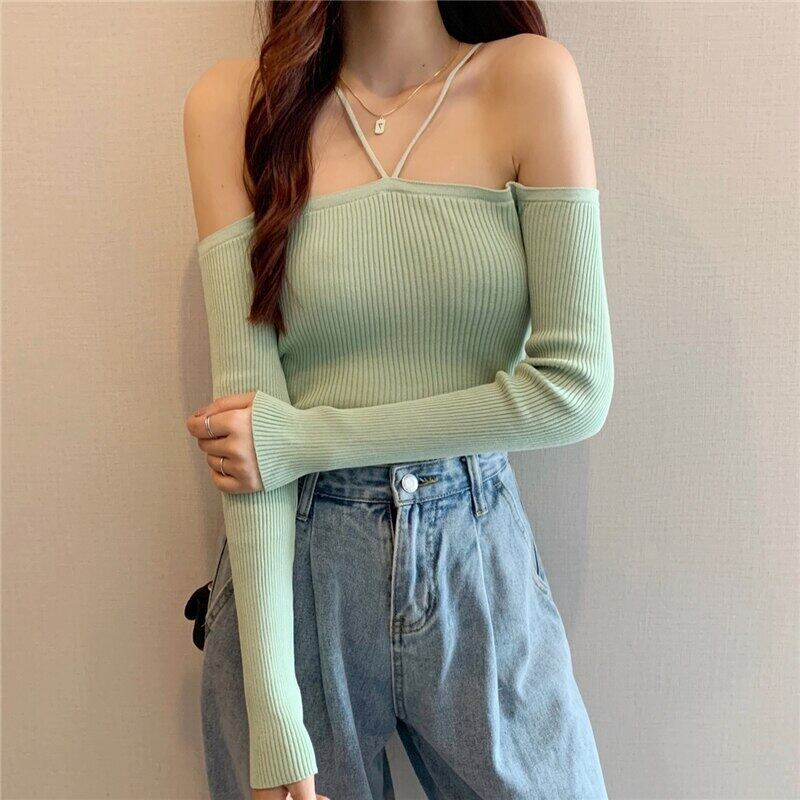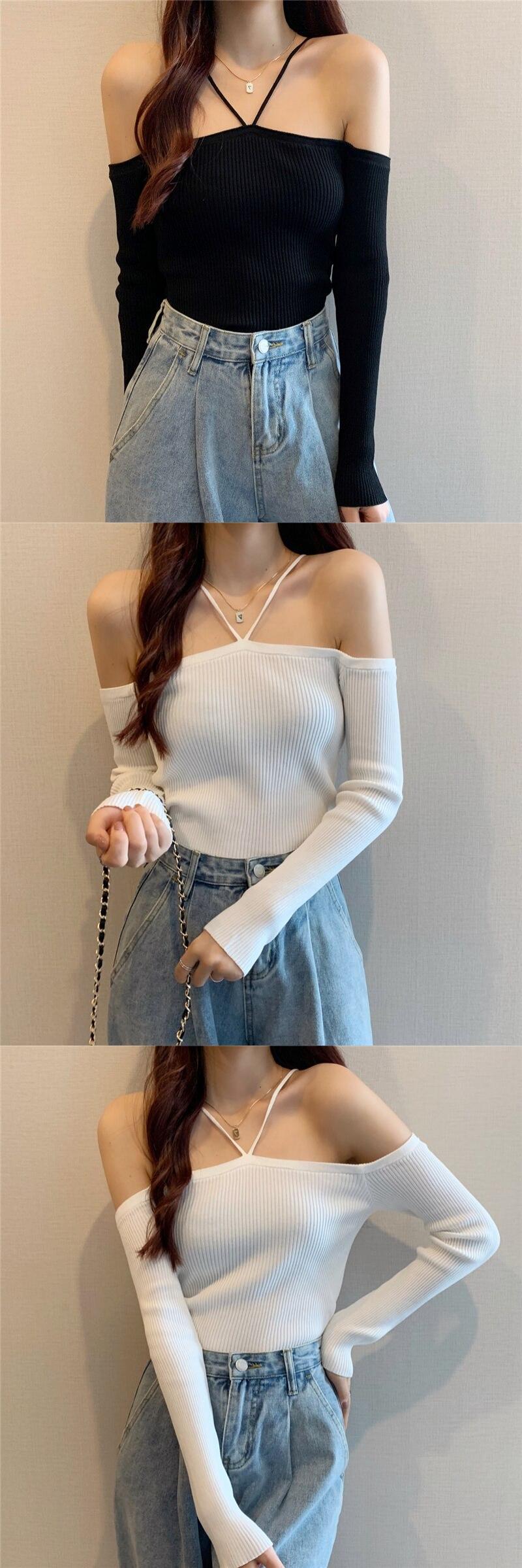 春秋のスタイルトップスセクシーなスラッシュネック黒、白のセーターオフショルダー長袖ニットプルオーバー女性 ロング ホワイト ブラック スプリング 春物 オータム 秋物 Son92900116523