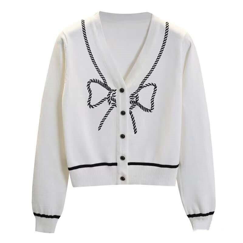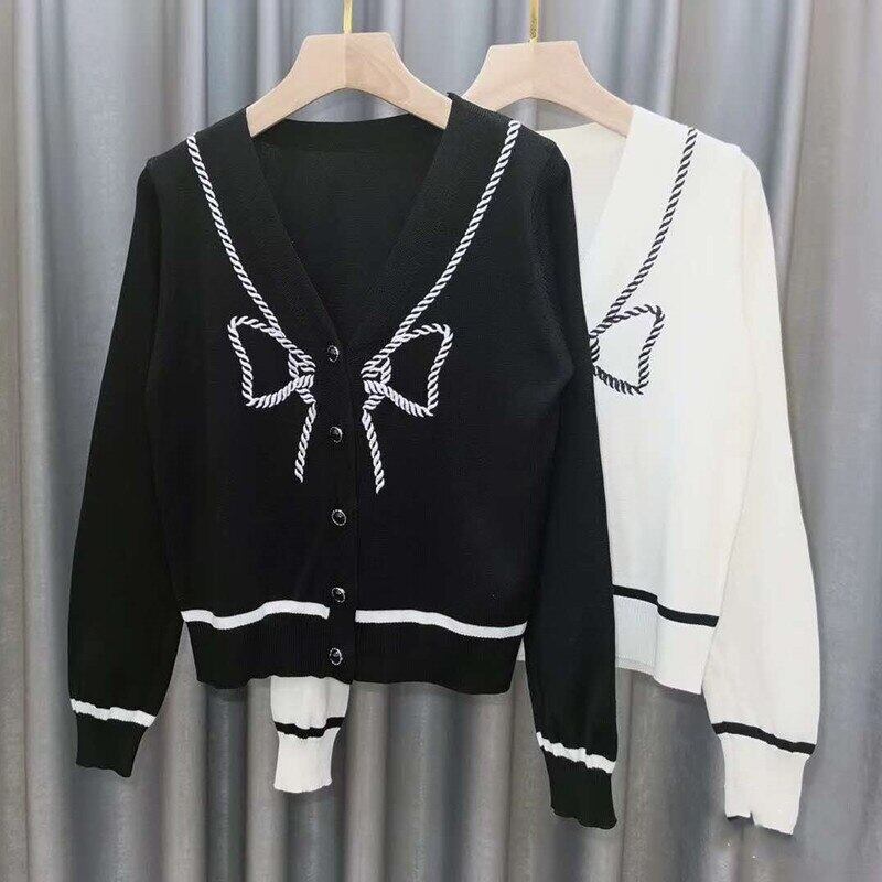 LJSXLS 弓刺繍セーター 2020 ニットセーター女性秋冬生き抜く V ネック長袖カーディガン ロング リボン オータム 秋物 ウィンター 冬物 Vネック Son18209714848