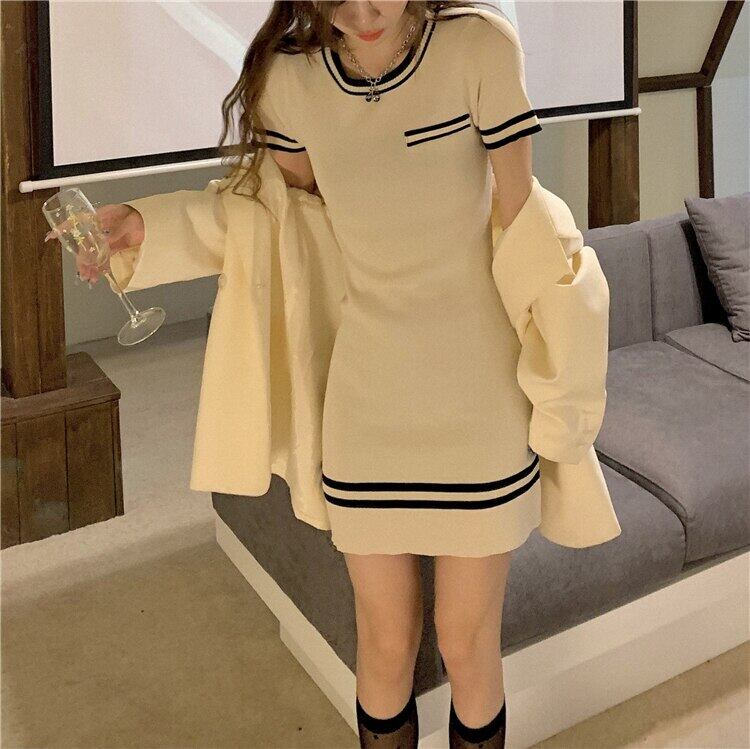 LJSXLS 夏の女性のニットドレス 2022 スタイルの女性服コントラストカラー弾性ドレス黒 O ネック Vestidos ブラック エラスティック 伸縮 サマー 夏物 Oネック Son89830012842