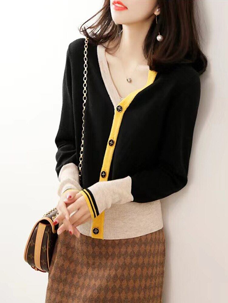 長袖黒カーディガンニット女性 2022 プル V ネックのセーターの女性の冬服秋スリムトップジャージー ロング ブラック オータム 秋物 ウィンター 冬物 Vネック Son7776725329