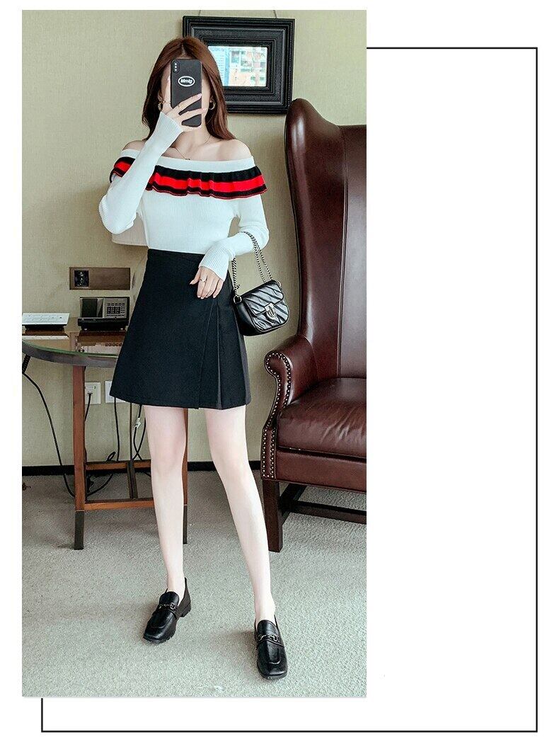 2021 セクシーなスラッシュネックオフショルダー女性セーターストライプフリルプルオーバーセーター春秋ニットスリム長袖トップ ロング ラッフル スプリング 春物 オータム 秋物 Son90474019108