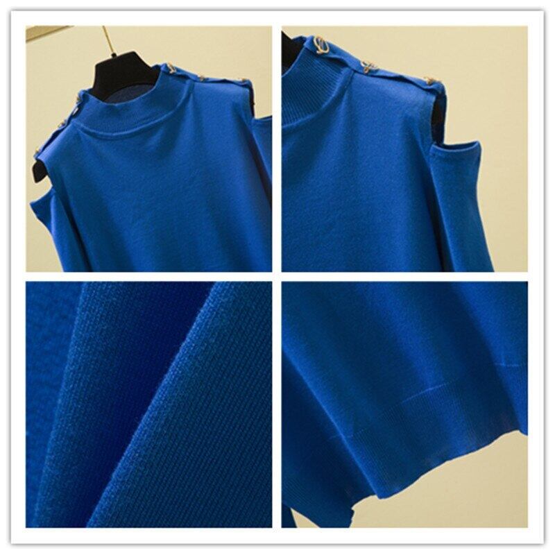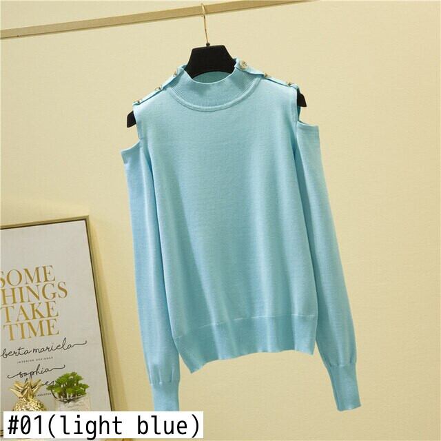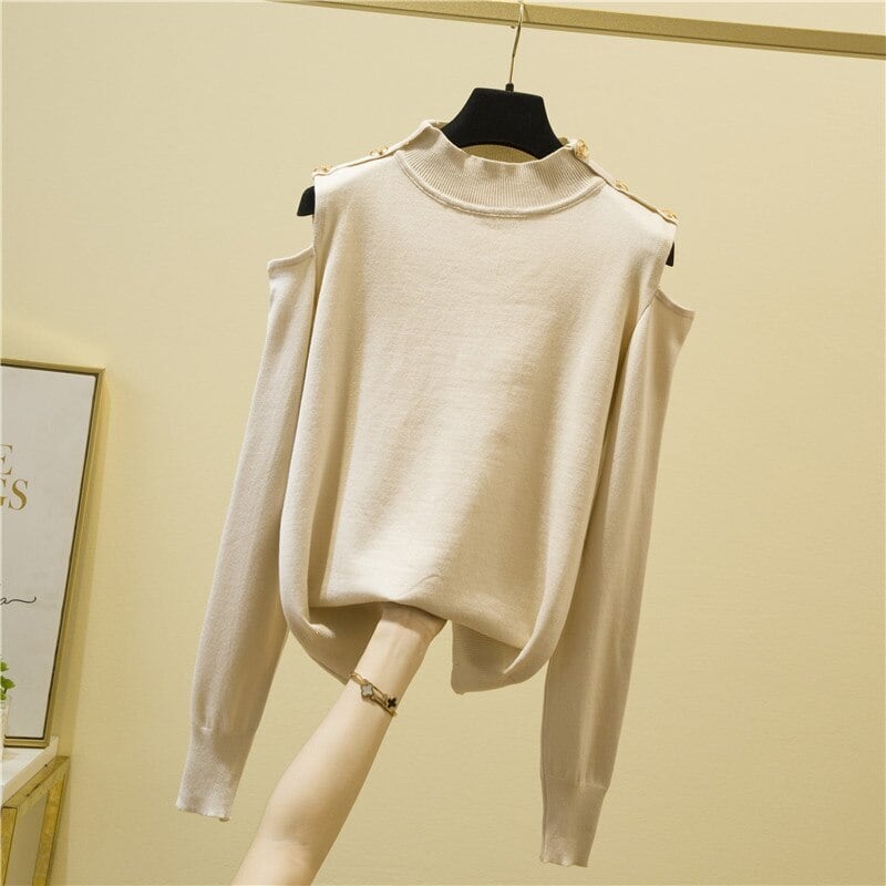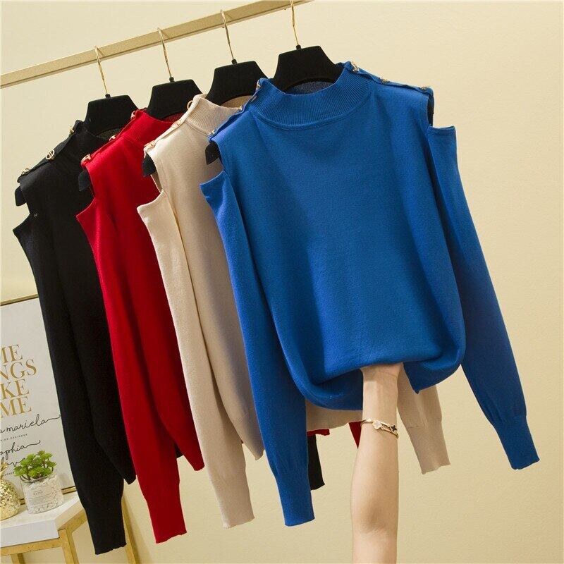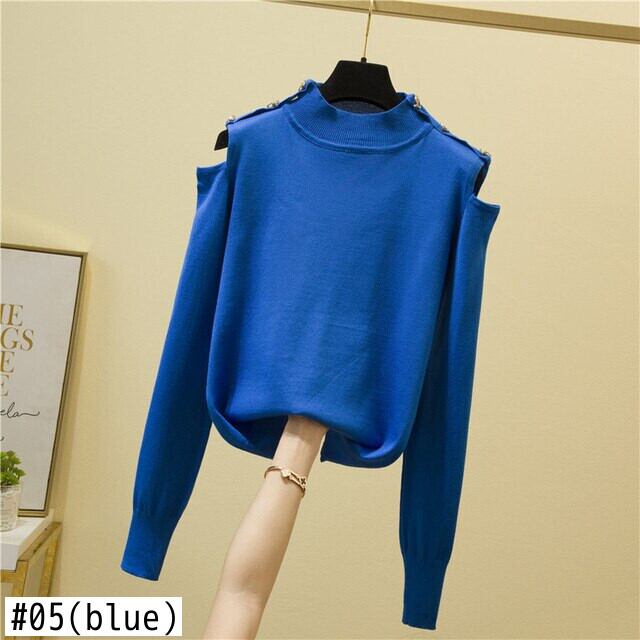 オフショルダータートルネックセーター女性 2022 秋冬金属ボタンニットセーター長袖プルオーバートップレディース ロング オータム 秋物 ウィンター 冬物 Son89677182717