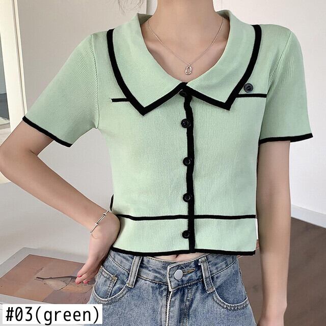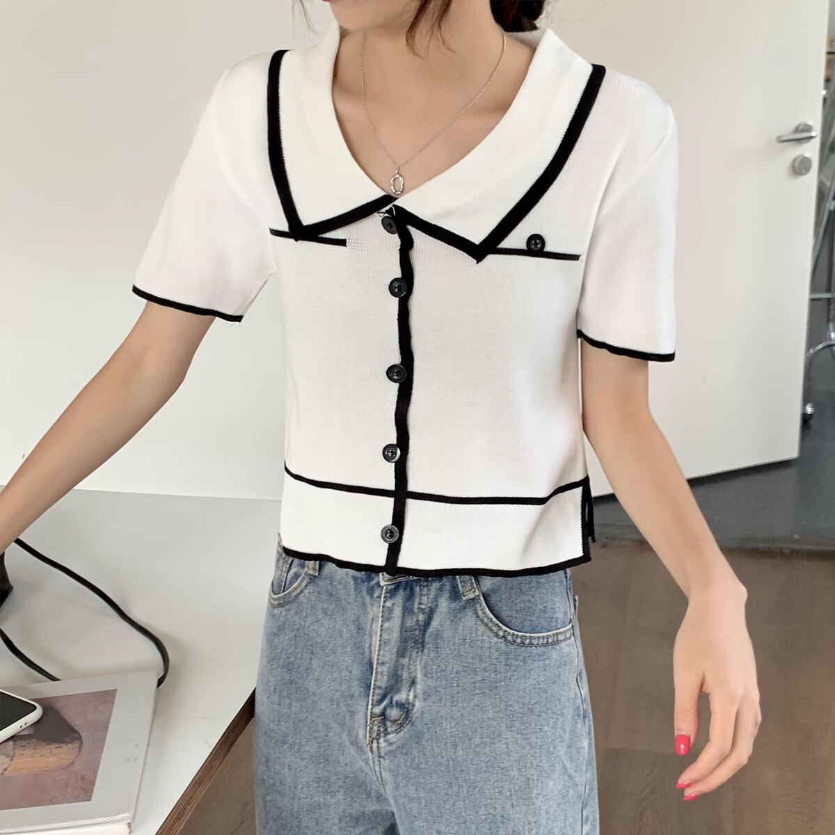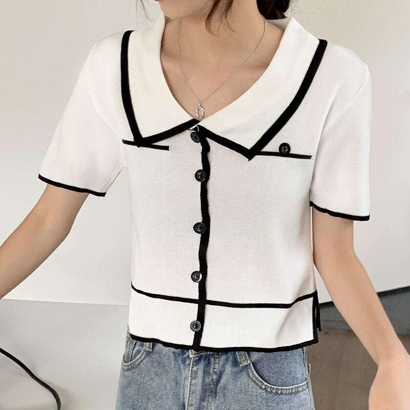 LJSXLS 夏ボタン黒ニット Tシャツ女性 ese セクシーなクロップトップスターンダウン襟半袖 Tシャツ ショート ブラック ハーフスリーブ サマー 夏物 Son79180699283