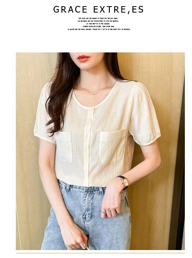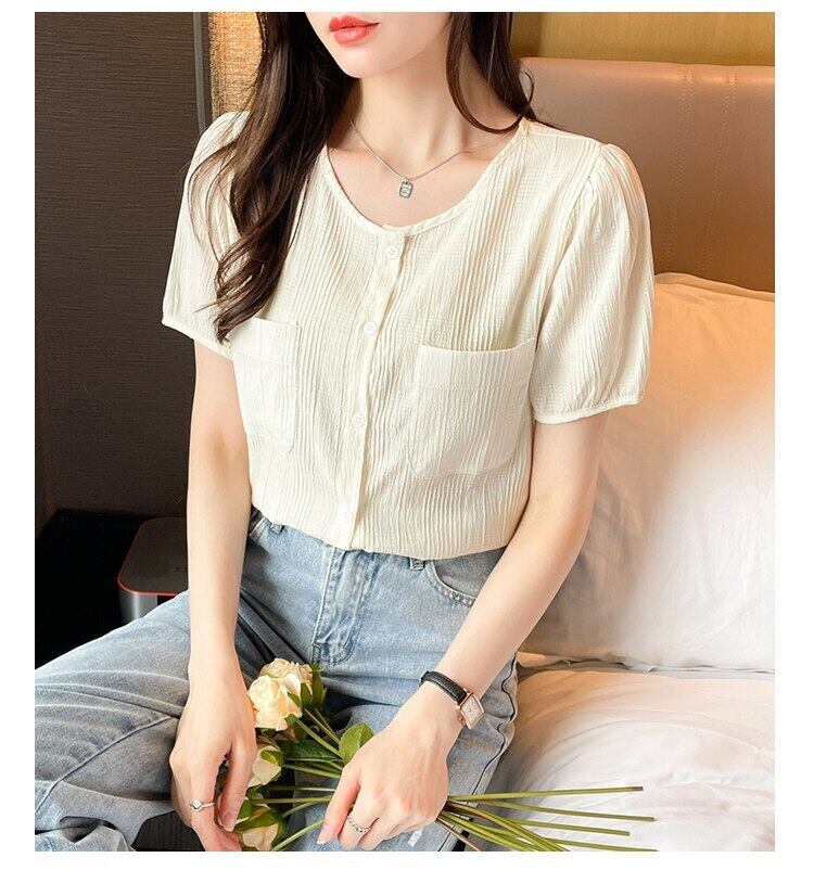女性トップスと Bloues 白半袖シャツ 2022 夏ブラウスゆったり服 O ネックポケットオフィスレディ ショート ホワイト ハーフスリーブ サマー 夏物 Oネック 会社 学校 通勤や通学にも Son68807137469