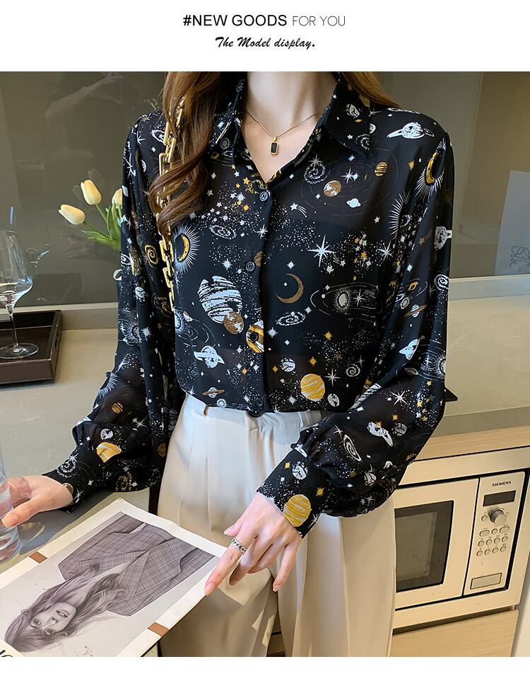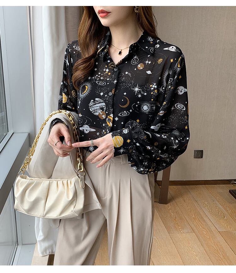 プリントブラウス長袖女性ターンダウンコラシャツランタンスリーブトップスシフォンブラウス 2022 春秋の女性の服 ロング スプリング 春物 オータム 秋物 Son50645027592