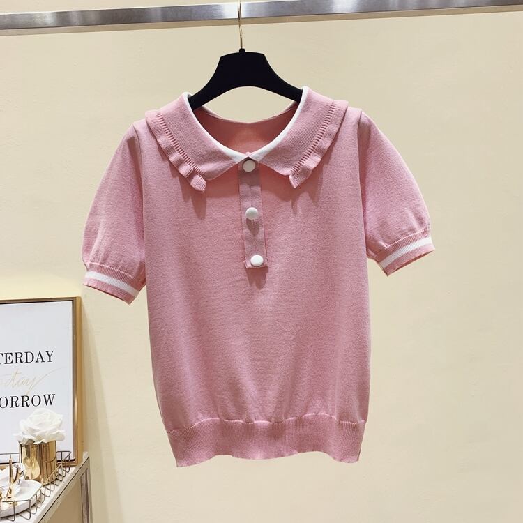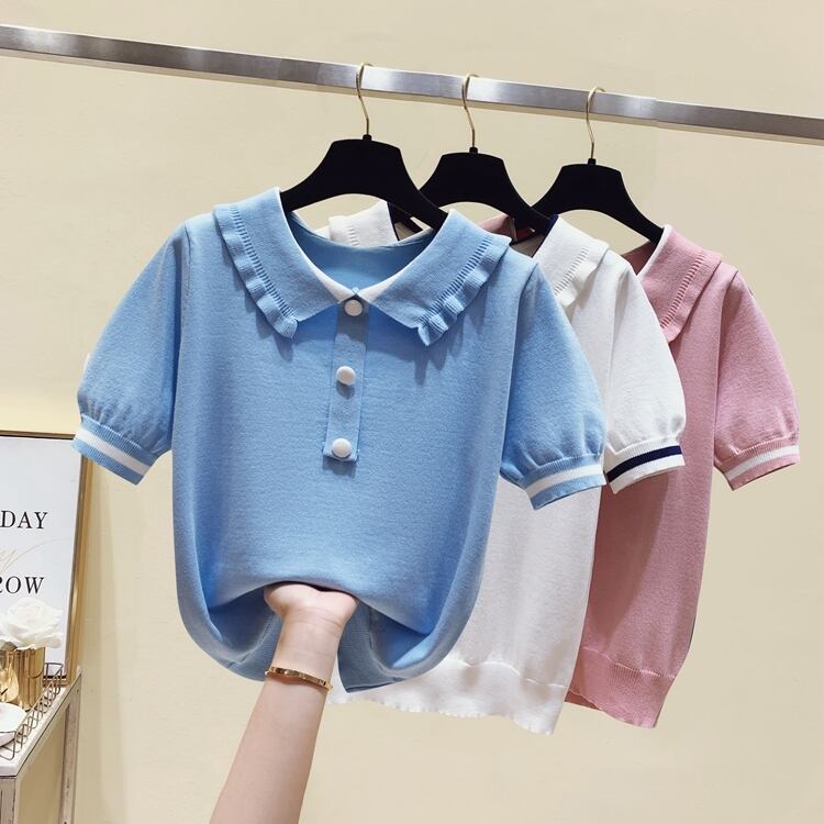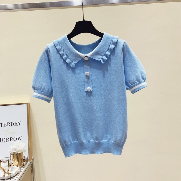ピーターパンの襟トップス女性 2022 夏薄型セーターボタンアップトップニットセーター服半袖プルオーバー ショート ハーフスリーブ サマー 夏物 Son41296895292