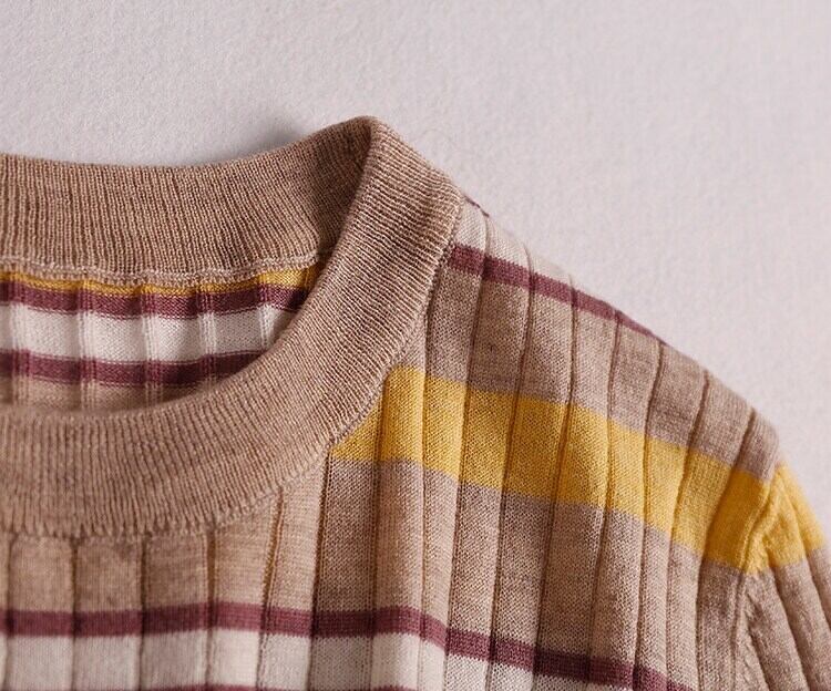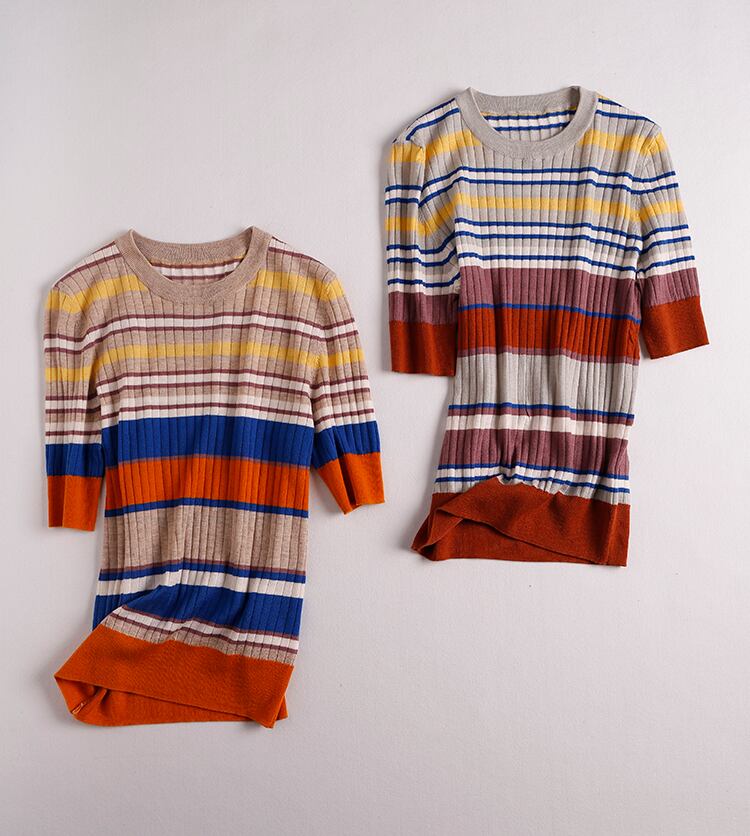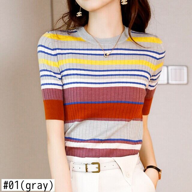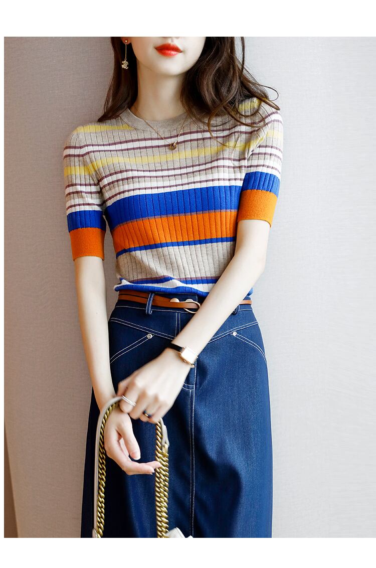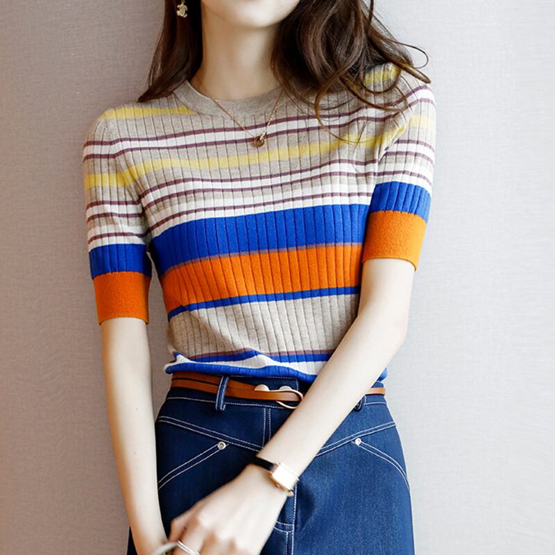 LJSXLS 2021 薄型女性 O ネックセータープルオーバー夏の女性ニットストライプセータープルオーバースリムショート Seleeve トップス サマー 夏物 Oネック Son13202078472