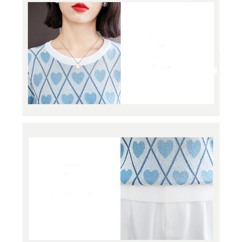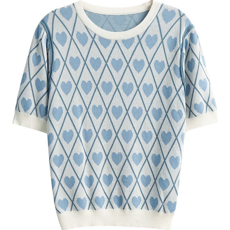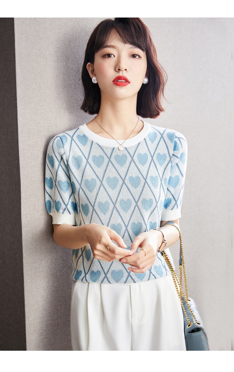 LJSXLS ニットセーター女 ショート ブルー 半袖 ハーフスリーブ 大人ガーリー スウィート キュート カジュアル サマー 夏物 Oネック Son91395365247