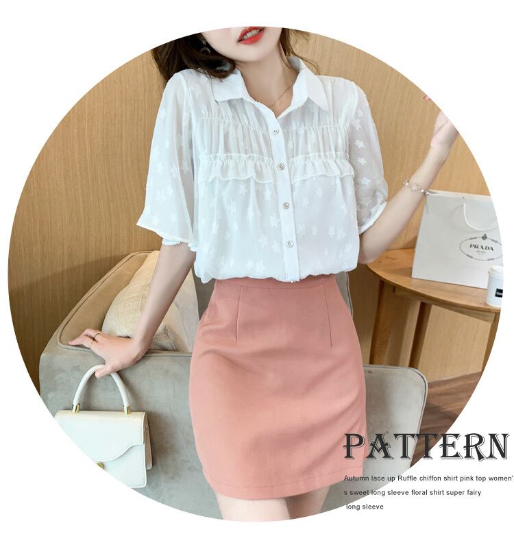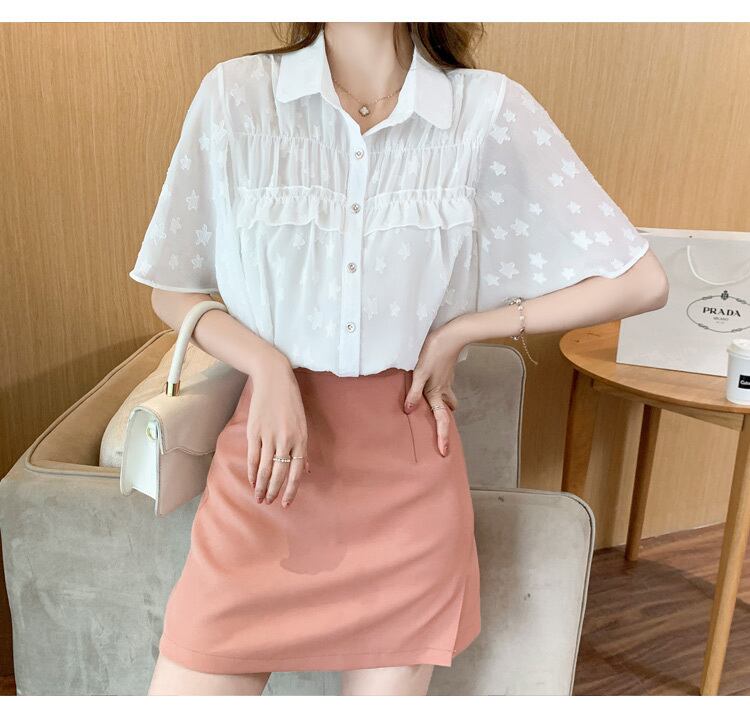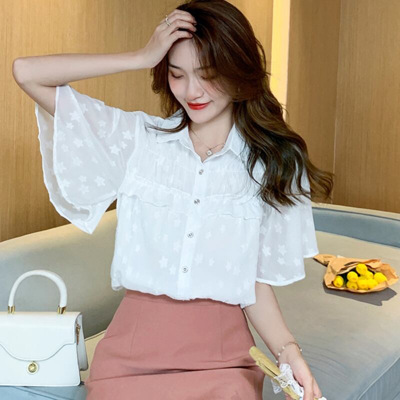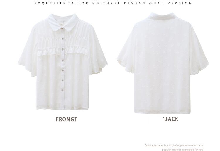 LJSXLS 半袖女性のブラウス夏シフォンターンダウン襟シャツ女性フリルトップ白オールマッチ服 ショート ホワイト ハーフスリーブ ラッフル サマー 夏物 Son48806484218