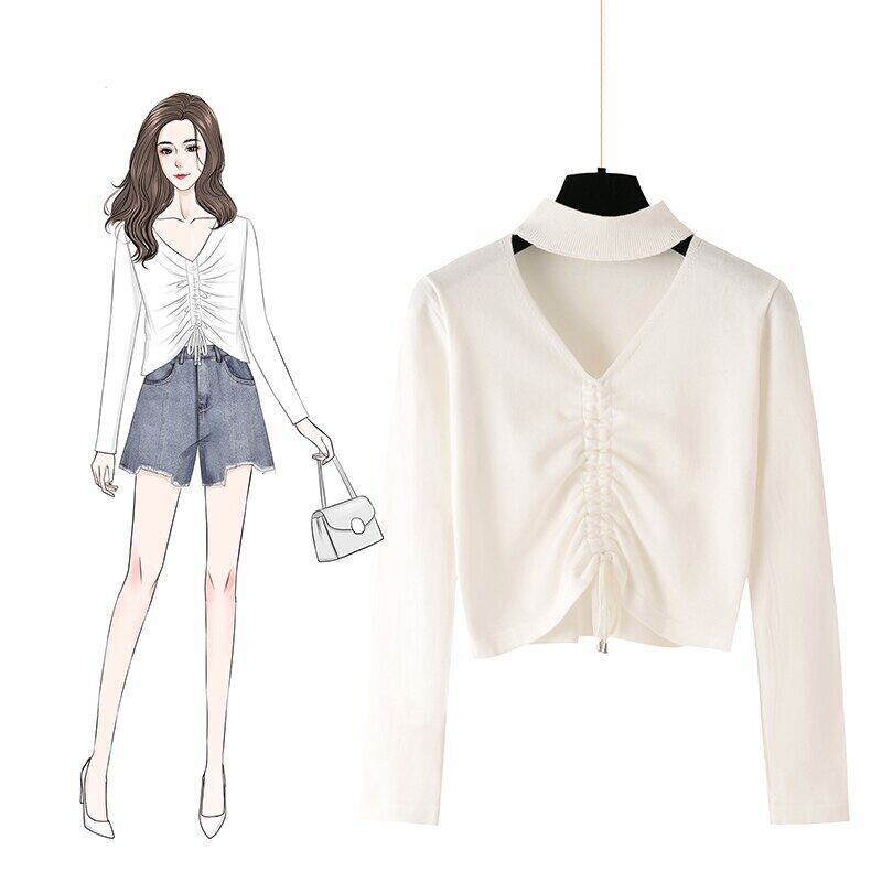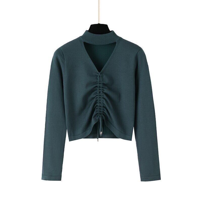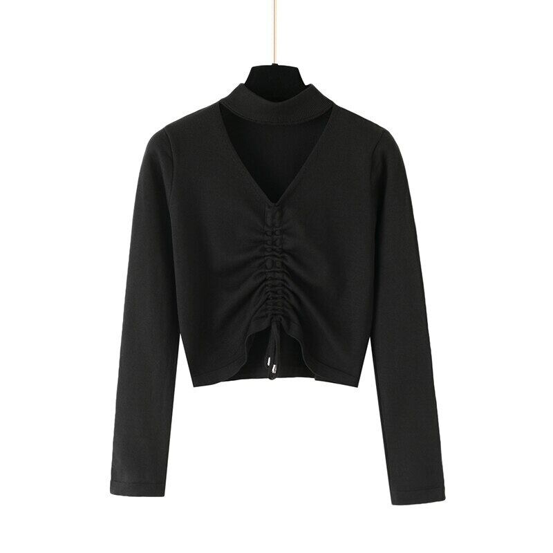LJSXLS 秋冬女性巾着黒のセクシーな中空アウト V ネックニットセータースタイルスリムクロップドプルオーバートップス ブラック オータム 秋物 ウィンター 冬物 Vネック Son23652929386