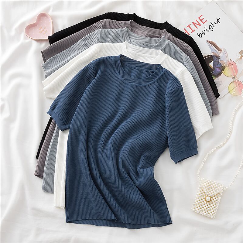 LJSXLS 2021 ブルースタイルジャンパーニットトップ女性春夏ソリッド半袖プルオーバーセーター女性 ショート ハーフスリーブ スプリング 春物 サマー 夏物 ソリッドカラー Son94668609653